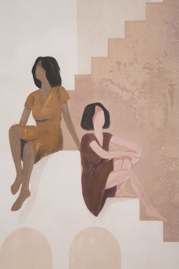 Pintura sobre lienzo con marco de madera que representa a dos mujeres sentadas en las escaleras. Los colores cálidos combinan a la perfección con cualquier tipo de mueble.