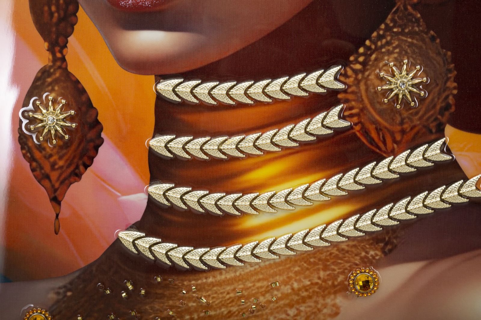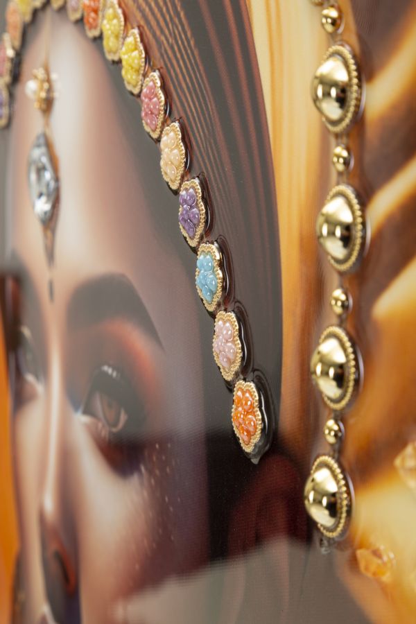 Pintura sobre lienzo con marco de madera que representa a una mujer con vestimenta tradicional y turbante. Completo con estructura de metal dorado.