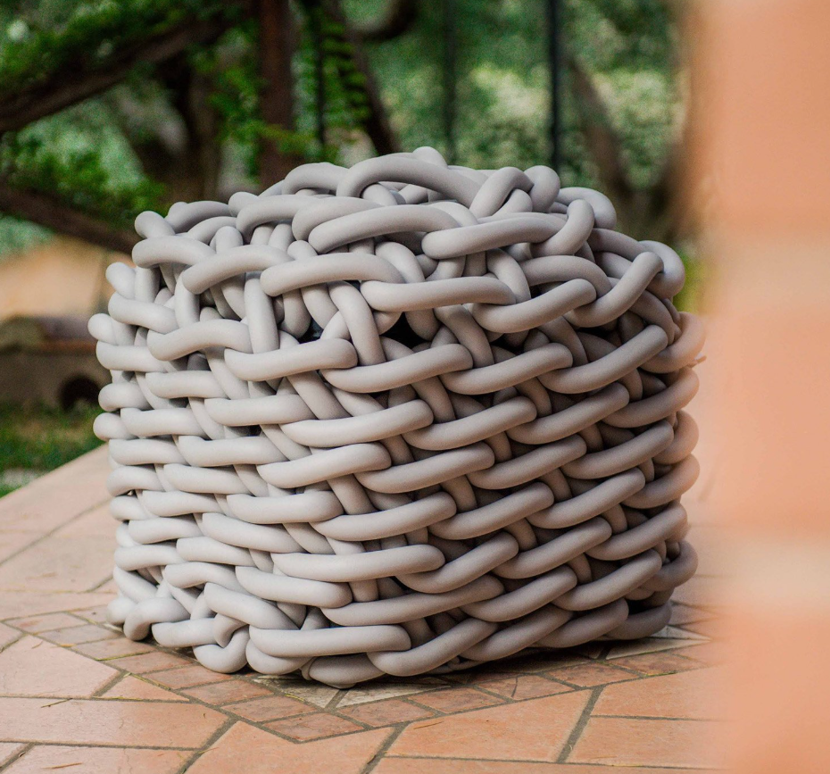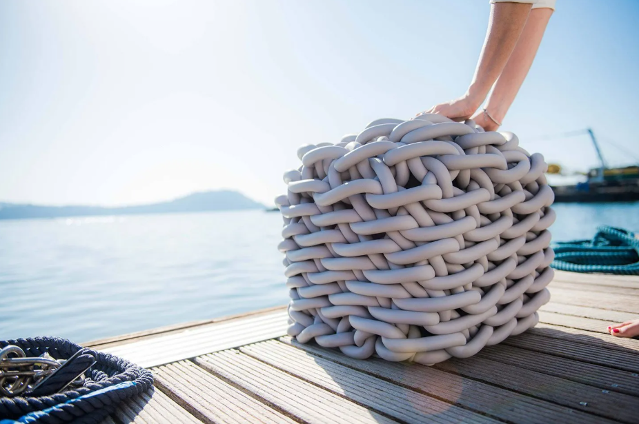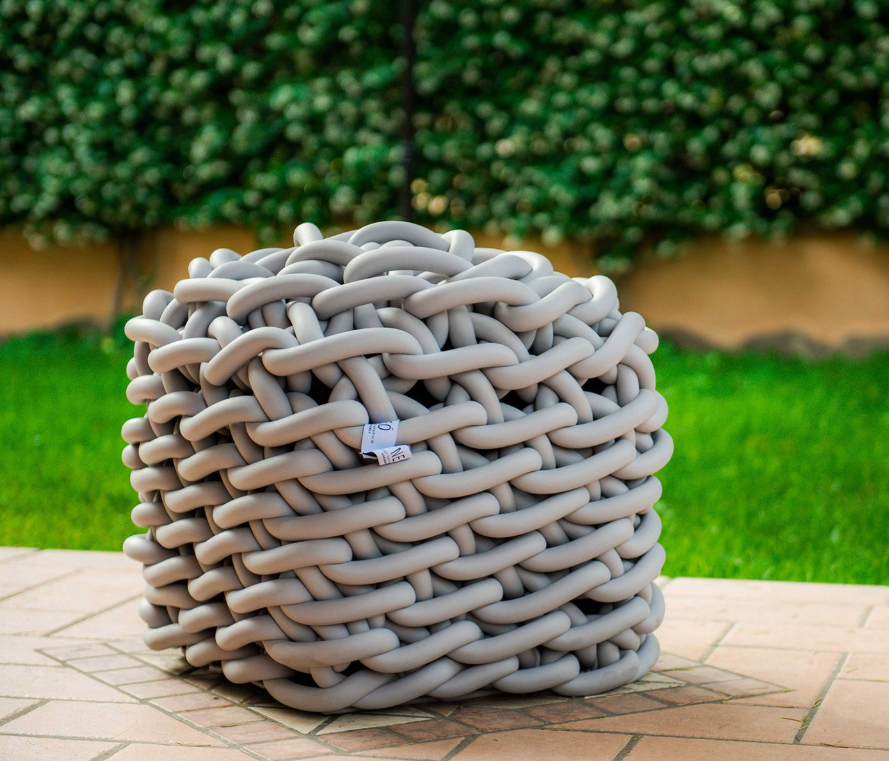 Pufs de crochet elaborados con hilo de caucho tejido, combinan diseño refinado, comodidad y sostenibilidad en piezas únicas hechas a mano.