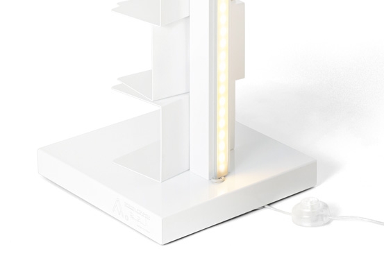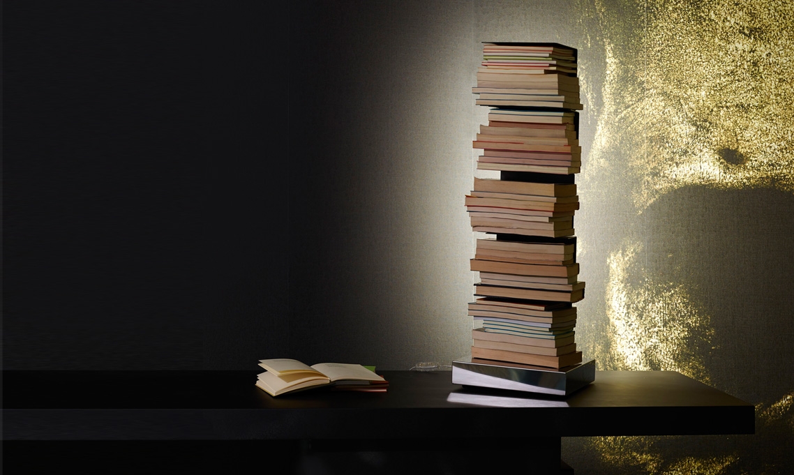 Gracias a su iluminación trasera, Ptolomeo Luce mejora el increíble efecto dado por la sensación de estar frente a una pila de libros muy simple y muy estable, capaz de desafiar la altura sin la necesidad de ningún soporte.