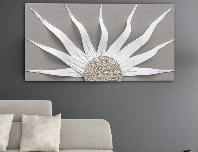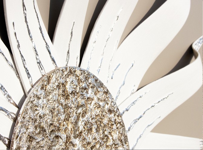 Panel de lona lacada en gris paloma con estructuras curvadas superpuestas lacadas en marfil y elemento central decorado a mano en pan de plata con acabado texturizado.