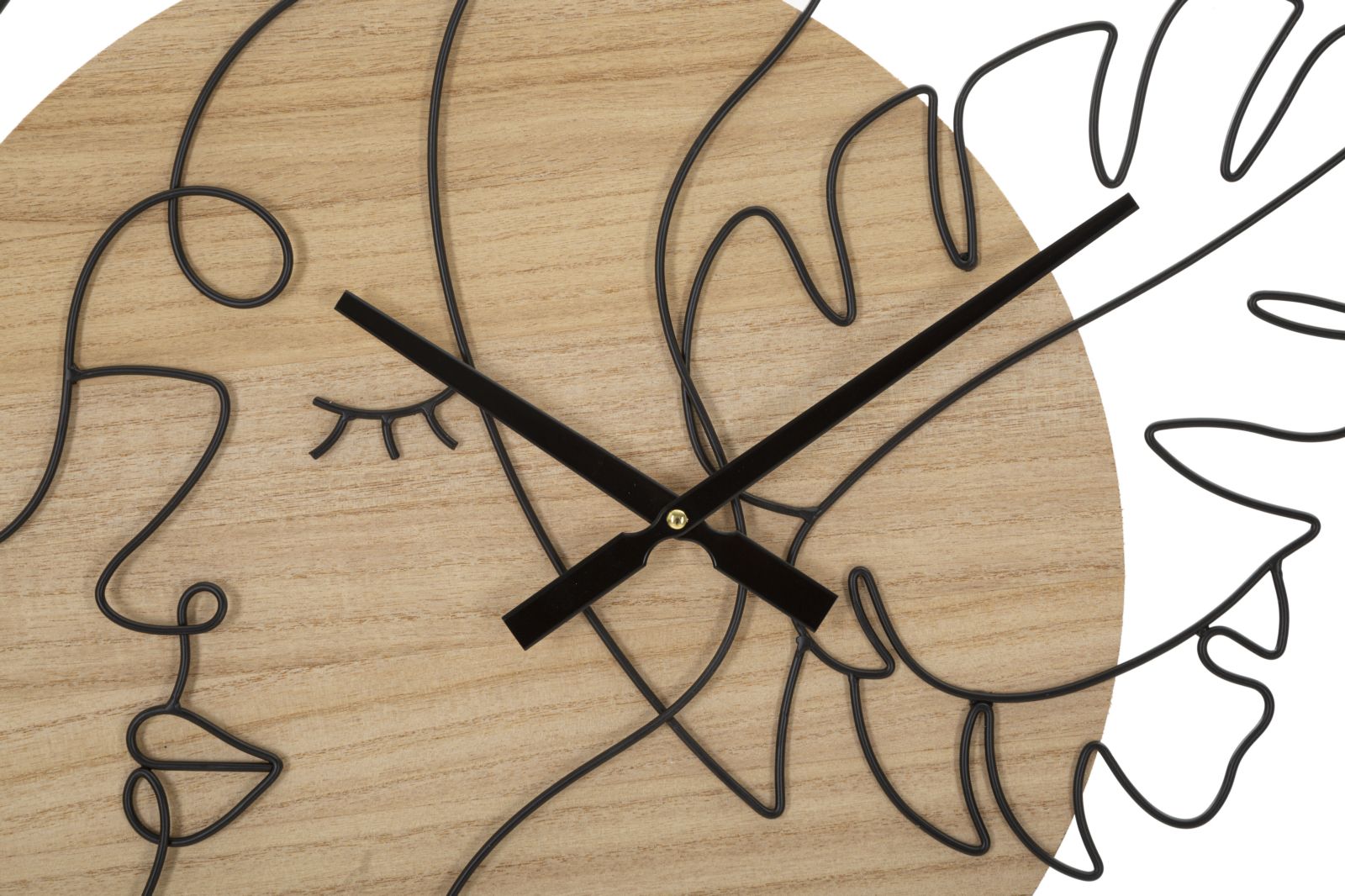 Reloj de pared redondo en metal y madera de líneas suaves y sinuosas que forman una esfera y hojas. Funcionamiento con pila AA no incluida.