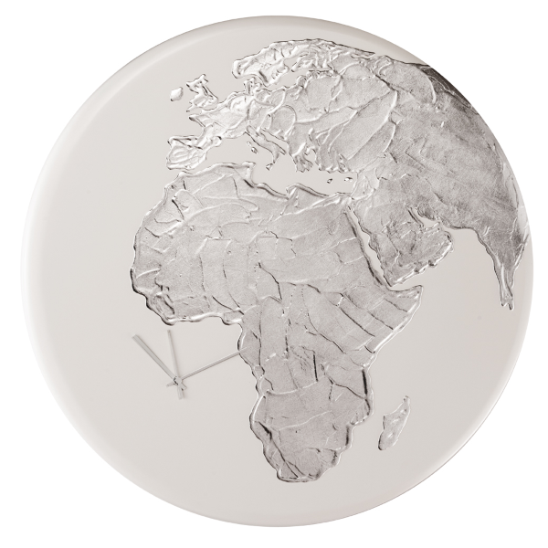 Reloj lacado marfil, decorado a mano con pan de plata sobre textura.