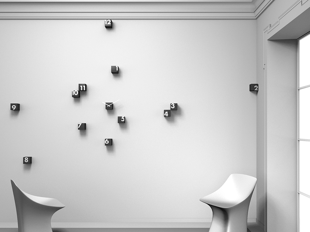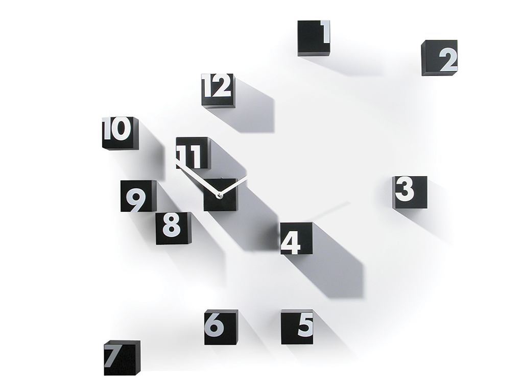 Reloj de pared, cubos en poliamida. Movimiento de cuarzo alimentado por batería. Reloj con opción personal de publicación en la pared, ya que los cubos deben fijarse libremente a la pared. Los cubos están disponibles en colores blanco y negro.
