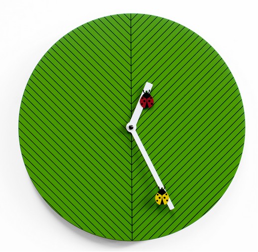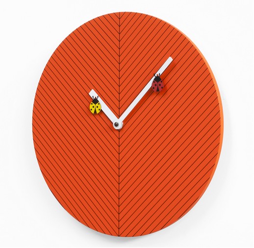 Redondo, discreto, colorido y divertido, este es Time2bugs, el reloj de pared que alegra las habitaciones de los más pequeños. En la esfera hay un gráfico con delgadas líneas negras que recuerdan las venas de una hoja en la que yacen dos mariquitas, en movimiento, una amarilla y la otra roja. La estructura es de madera. Movimiento de batería de cuarzo.