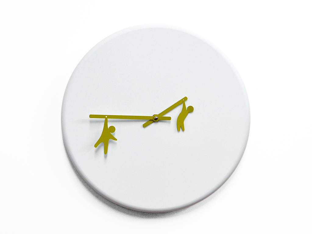 El reloj demuestra el deseo de interpretar el paso del tiempo de una manera irónica y juguetona, trayendo un poco de felicidad en cualquier momento del día. Los pequeños hombres que se aferran a las manos muestran su espectáculo como trapecistas de circo. Hecho de madera. Movimiento de batería de cuarzo.