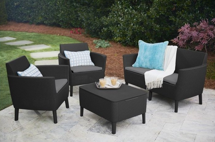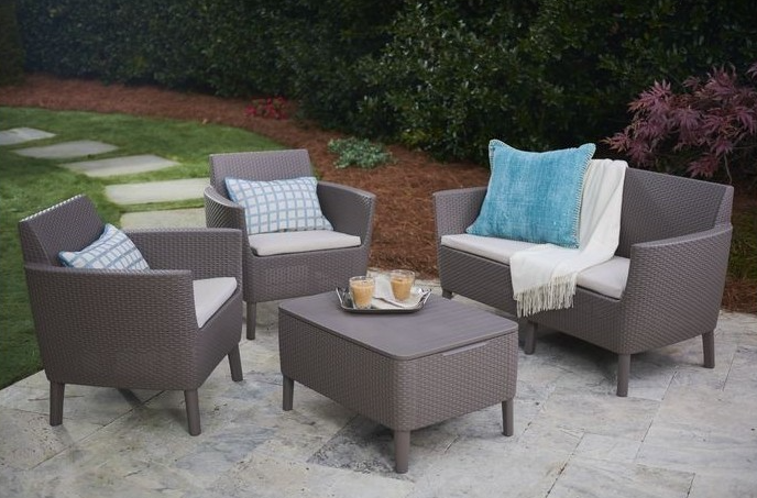 El conjunto Carolina de Keter se compone de un sofá, dos sillones y una mesa de centro elevable con acabado de resina efecto madera.