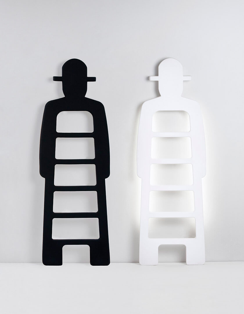 La mente creativa de Giò Colonna Romano ha transformado un elemento esencial pero voluminoso como la escalera, en una escultura funcional para exponer en la casa. Mr. Giò es una escultura-escalera irónica y llena de ingenio, que puede utilizarse como galán de noche, con un diseño que recuerda a un hombre con bombín. También disponible en la versión retroiluminada Mr. Giò Light con tubos de neón.