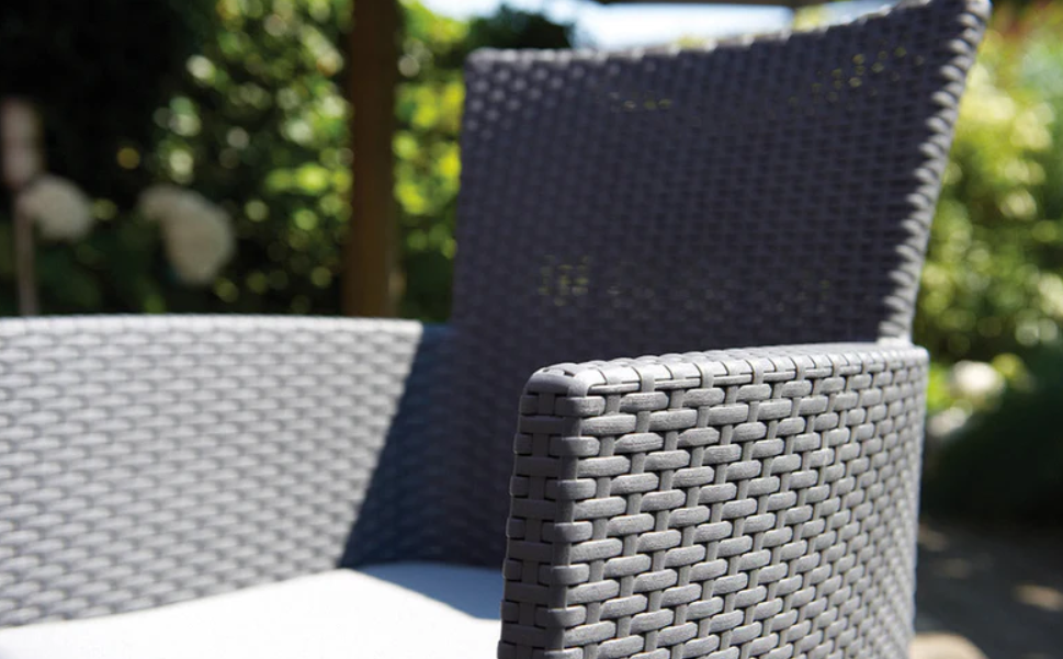 Fabricada en resina de alta calidad con acabado efecto ratán tejido, es resistente a la lluvia, al sol y a la intemperie, sin decolorarse ni deformarse con el tiempo.