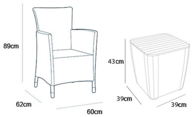 Sillón (cada uno): 62cm (ancho) x 60cm (profundidad) x 89cm (alto)