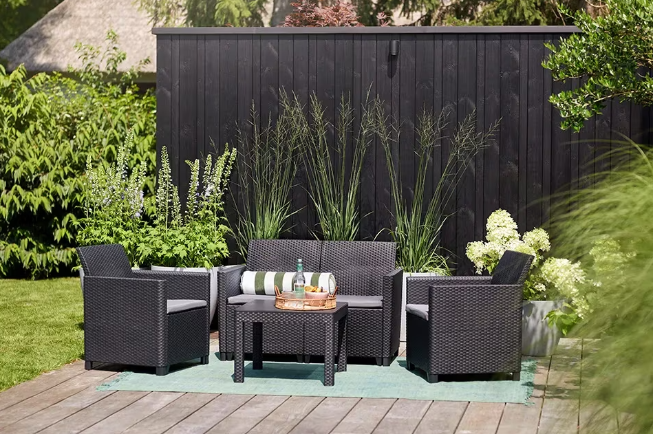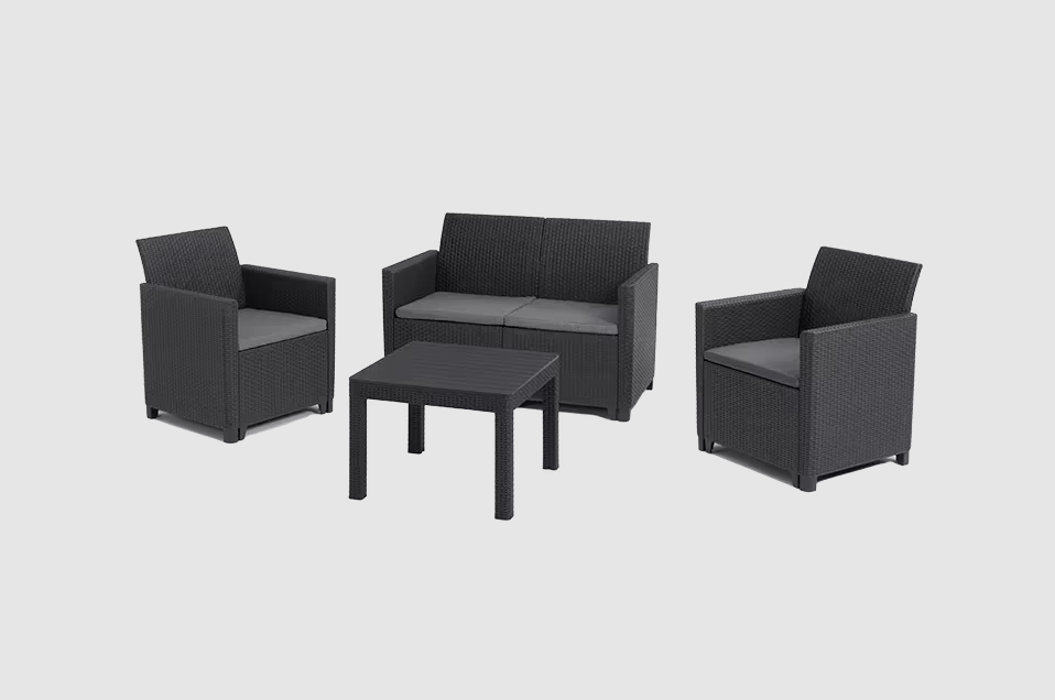 El conjunto Marie de Keter es un conjunto de salón de jardín compuesto por sofá, sillones y mesa de centro con acabado efecto ratán tejido en resina de alta resistencia.