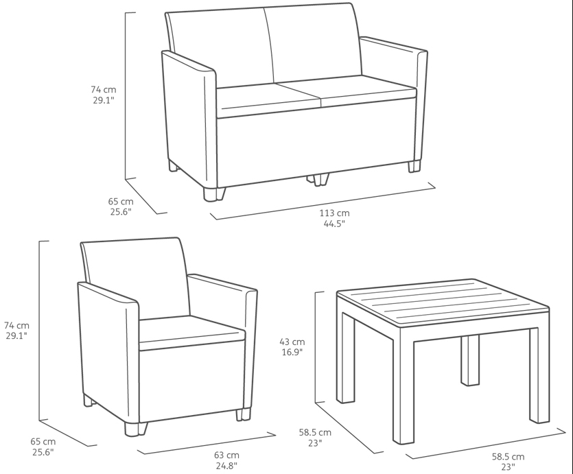 Las dimensiones aproximadas son: sofá 113x65x74 cm, sillones 63x65x74 cm, mesa de centro 58,5x58,5x43 cm.