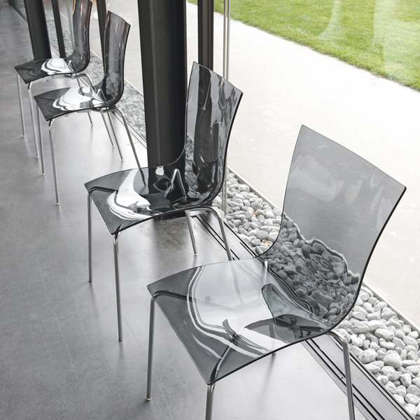 Silla apilable, carcasa en polímero impreso; Estructura en metal lacado o cromado.
