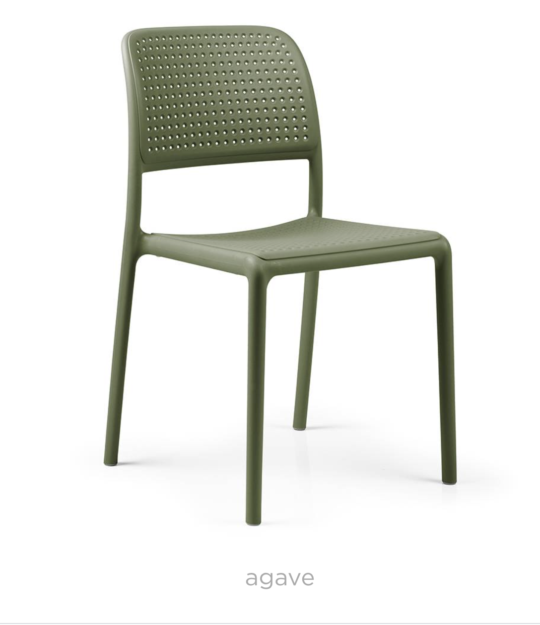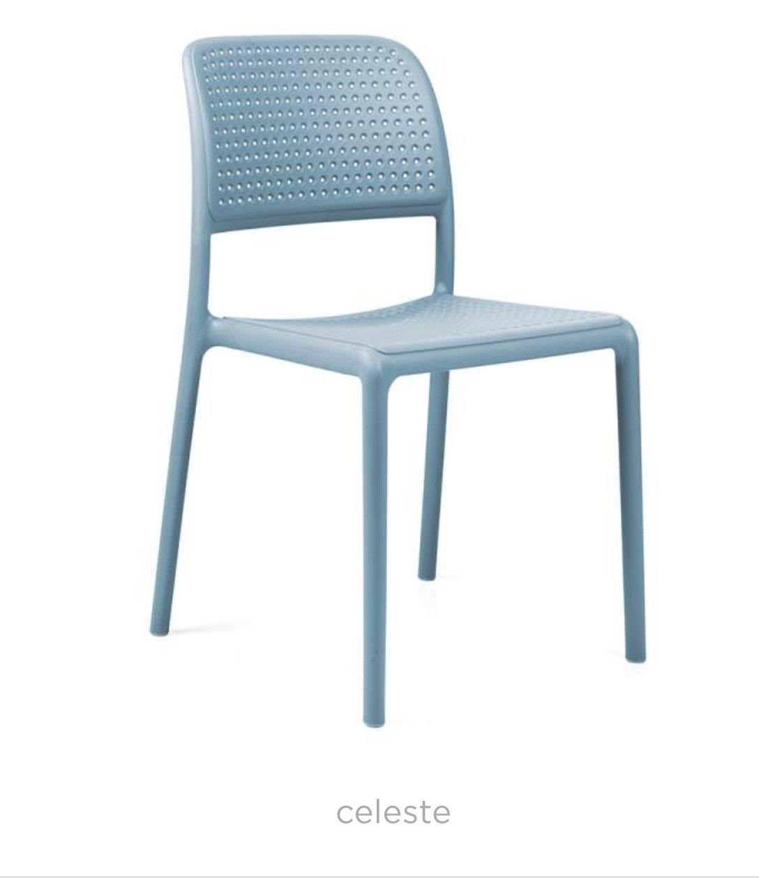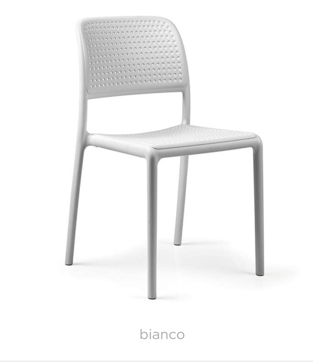 Silla monobloque sin reposabrazos. Polipropileno de fibra de vidrio con tratamiento anti-UV y coloreado en masa. Acabado mate. Incluye patas antideslizantes. Resina reciclable.