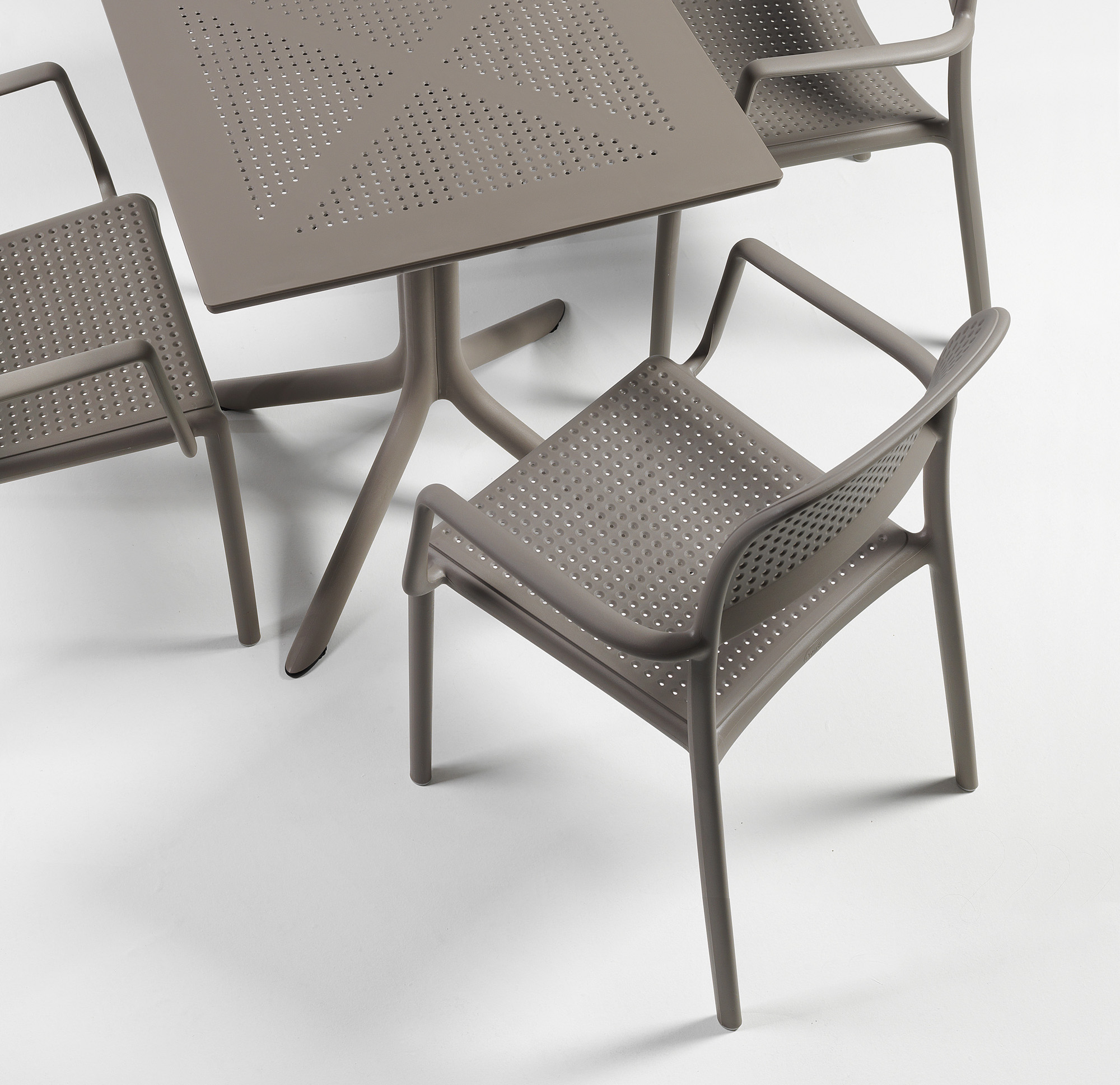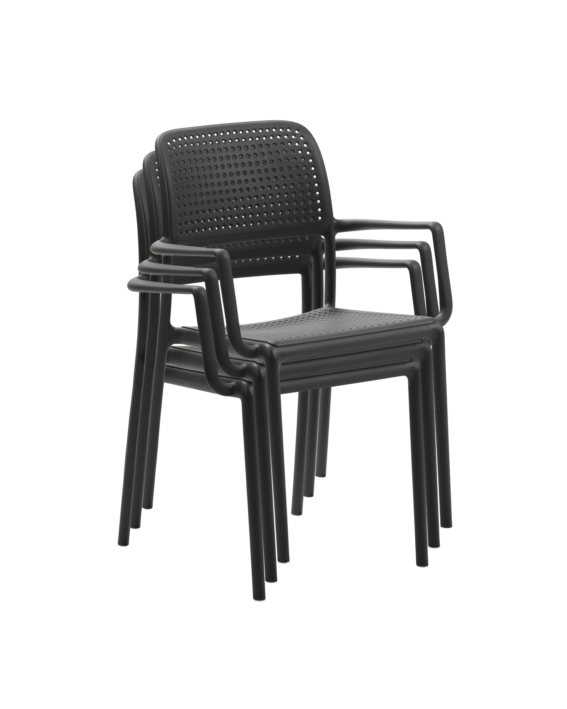 Silla monobloque con reposabrazos. Polipropileno de fibra de vidrio con tratamiento anti-UV y coloreado en masa. Acabado mate. Patas antideslizantes. Resina reciclable.