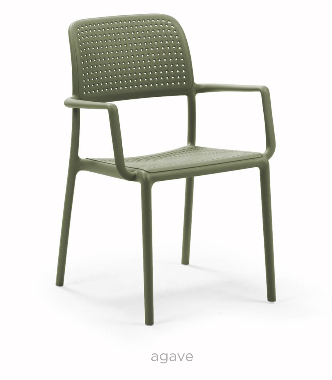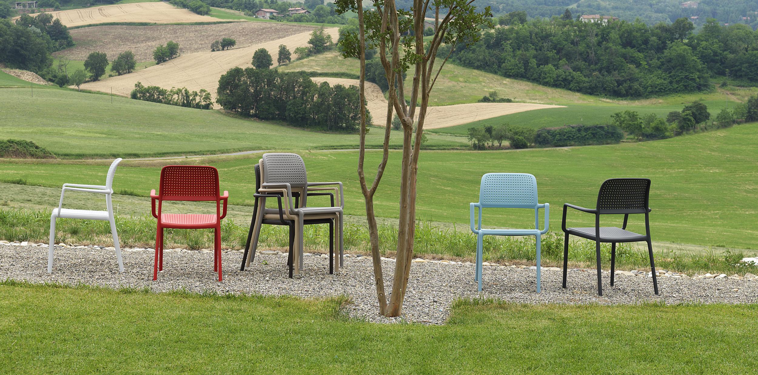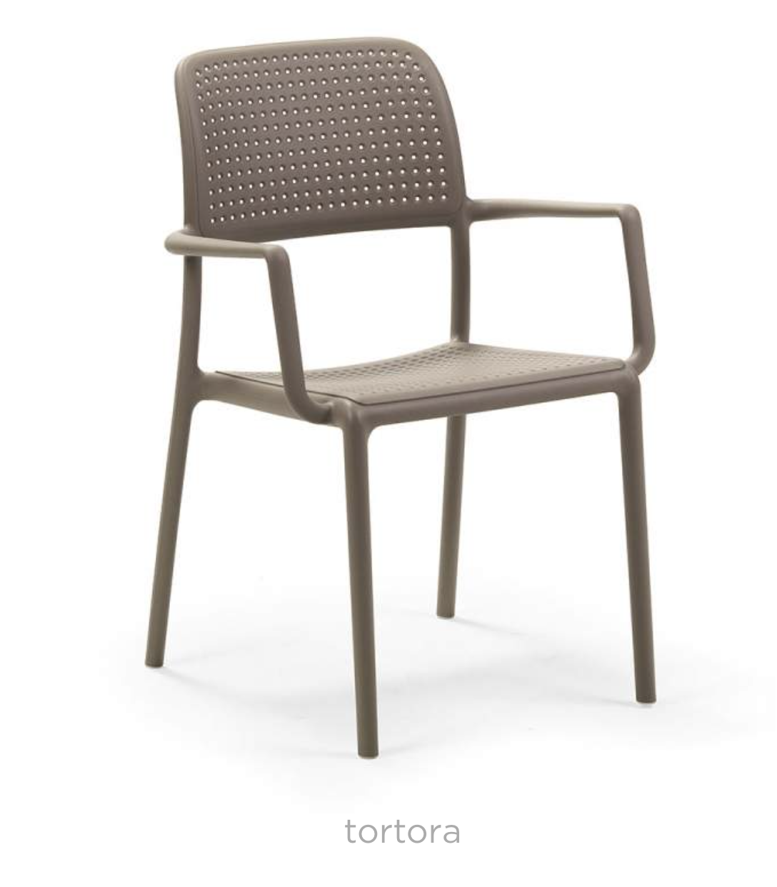 Ligero y fresco, Bora es un cómodo asiento de resina de fibra de vidrio con reposabrazos, con una estructura tubular sin costuras y perfiles redondeados. El asiento y el respaldo forman una sola unidad, realzando estéticamente sus formas que evocan un suave acolchado textil.