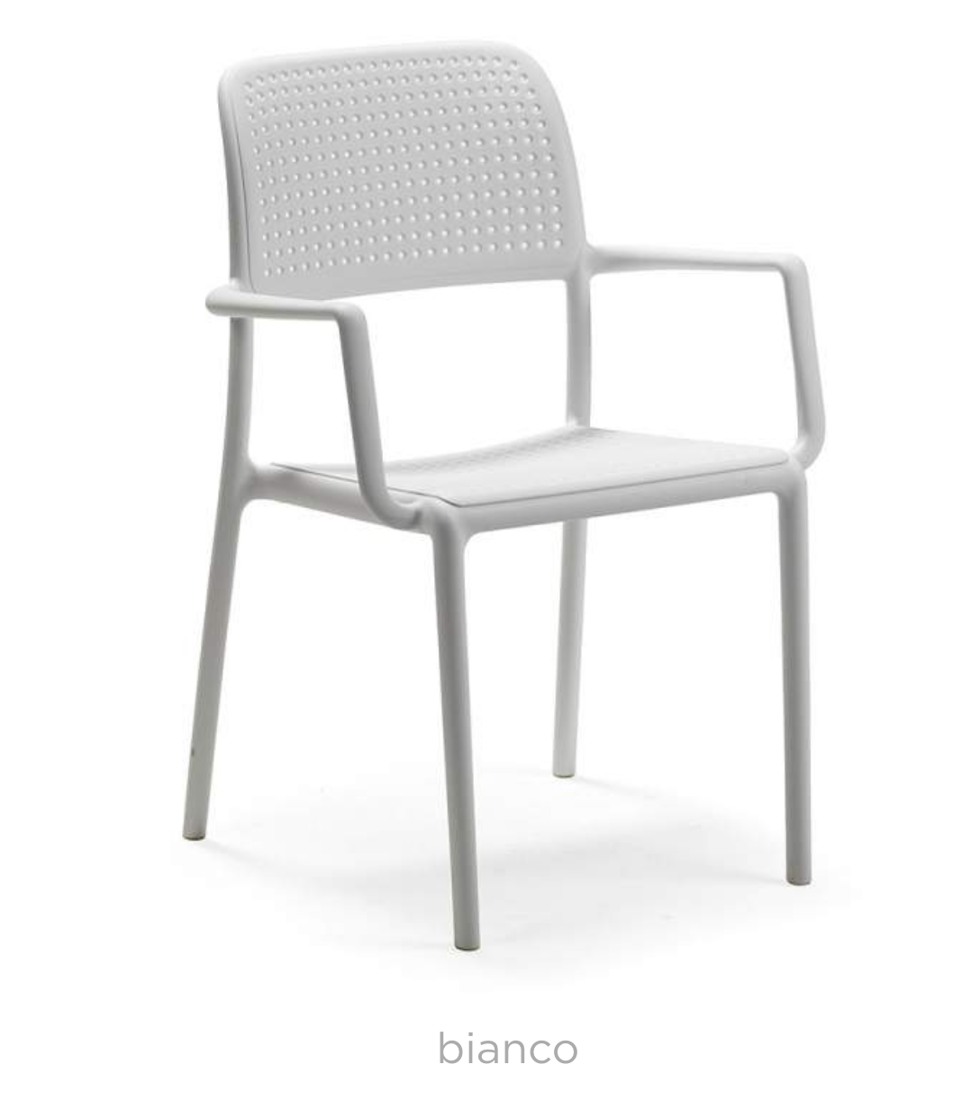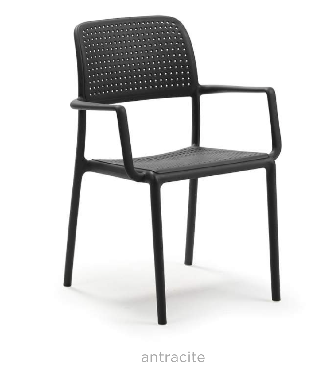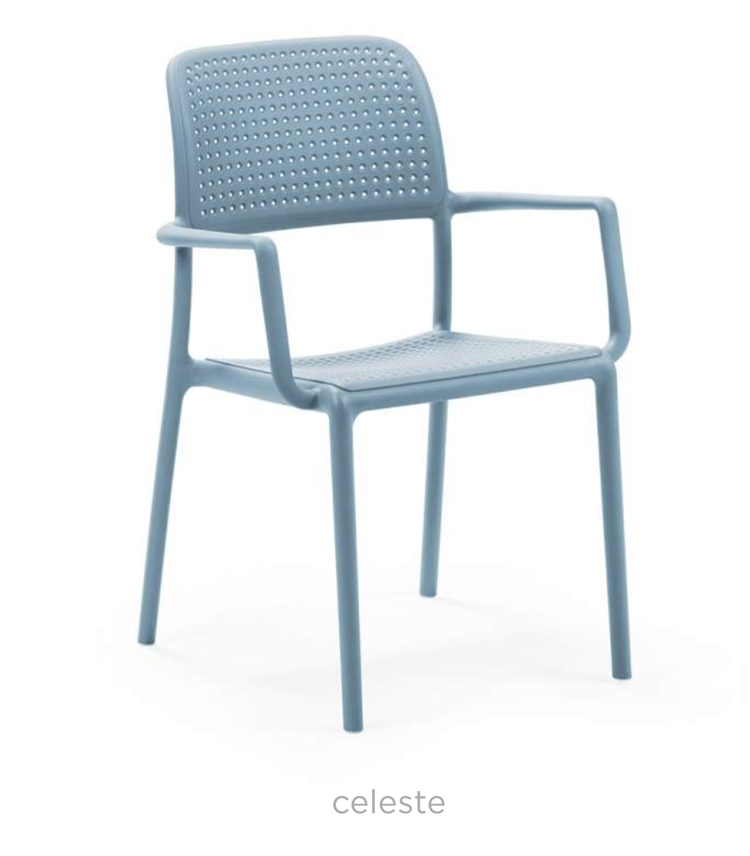 Ligero y fresco, Bora es un cómodo asiento de resina de fibra de vidrio con reposabrazos, con una estructura tubular sin costuras y perfiles redondeados. El asiento y el respaldo forman una sola unidad, realzando estéticamente sus formas que evocan un suave acolchado textil.