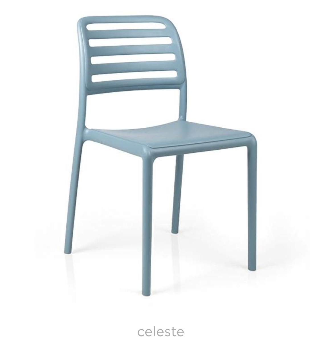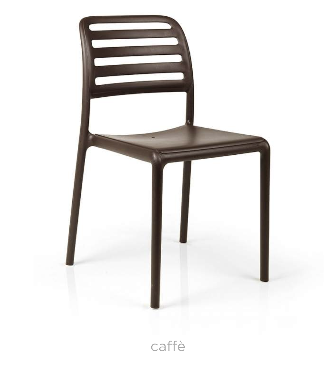 Líneas esenciales para un asiento ligero, práctico y confortable sin apoyabrazos. Costa es una silla de exterior con respaldo de listones en resina de fibra de vidrio: un solo tubo de resina, sin interrupciones, con perfiles y esquinas redondeados.
