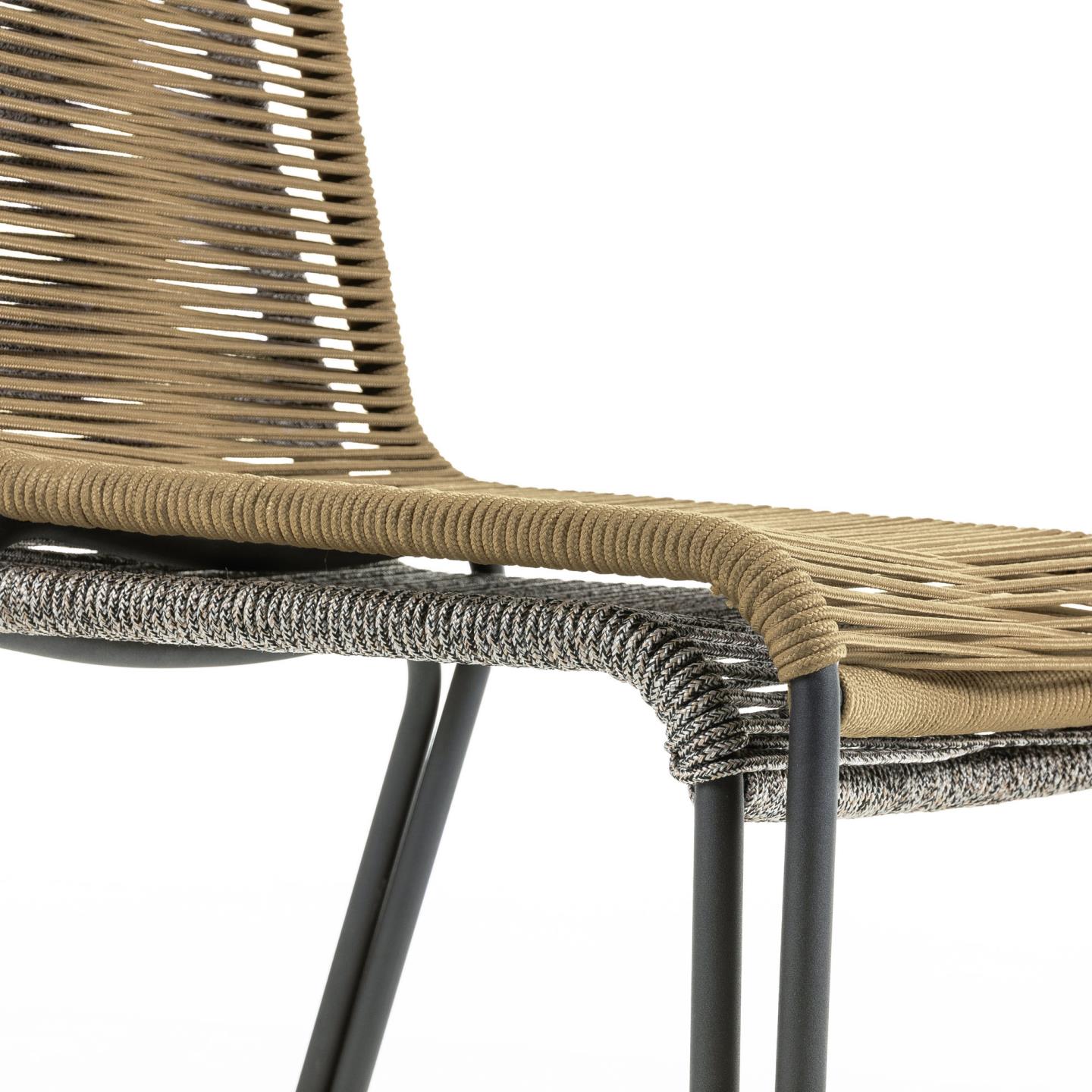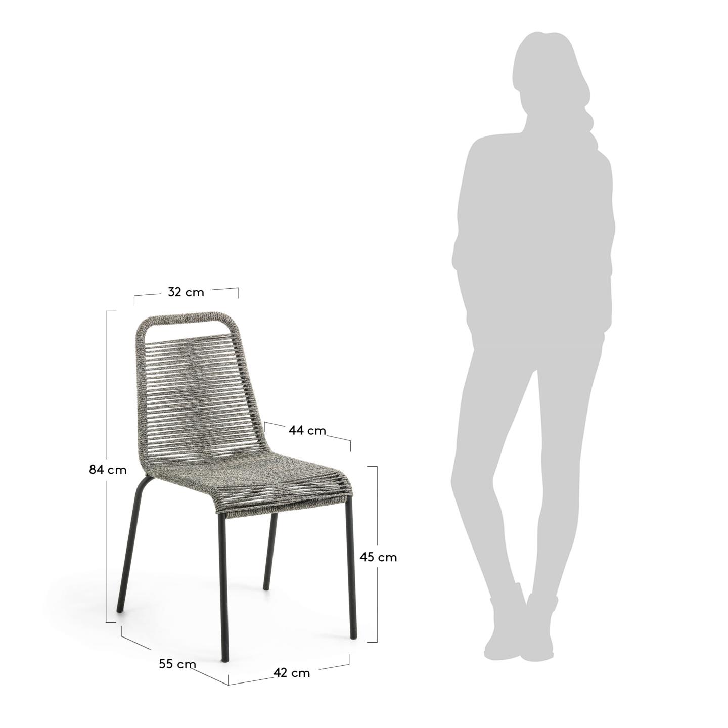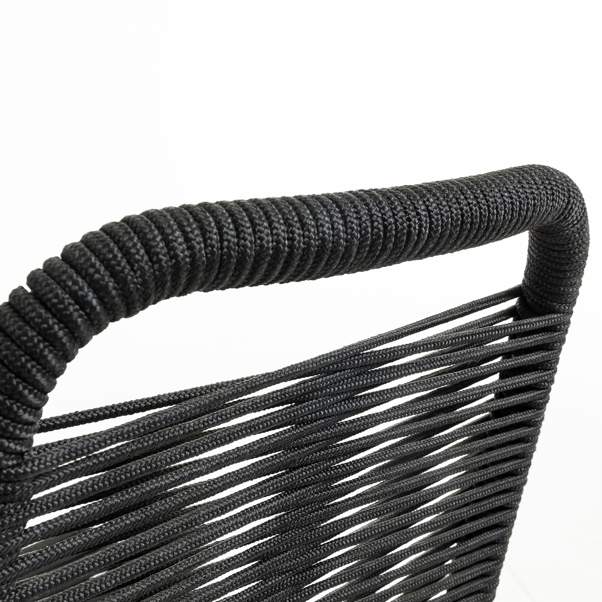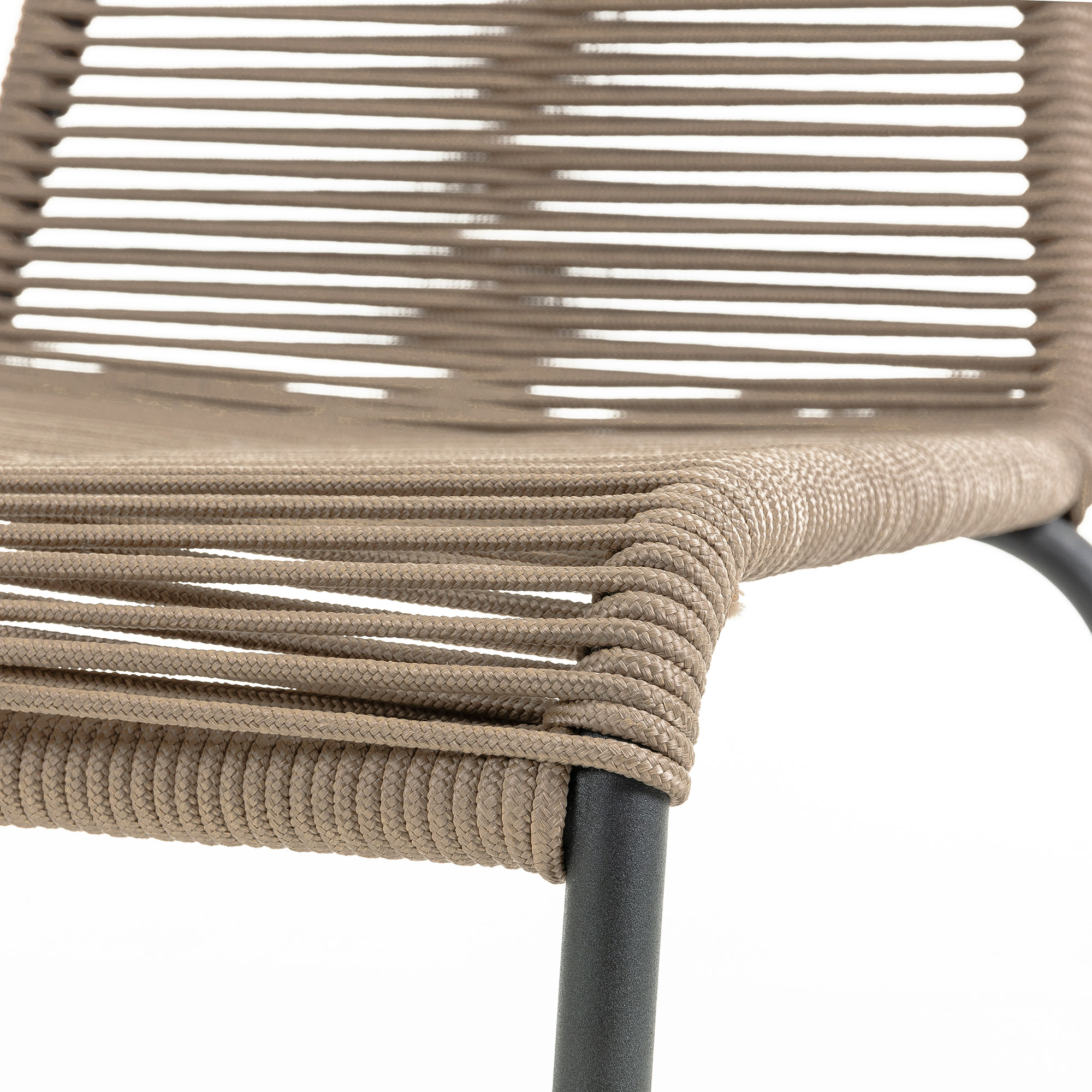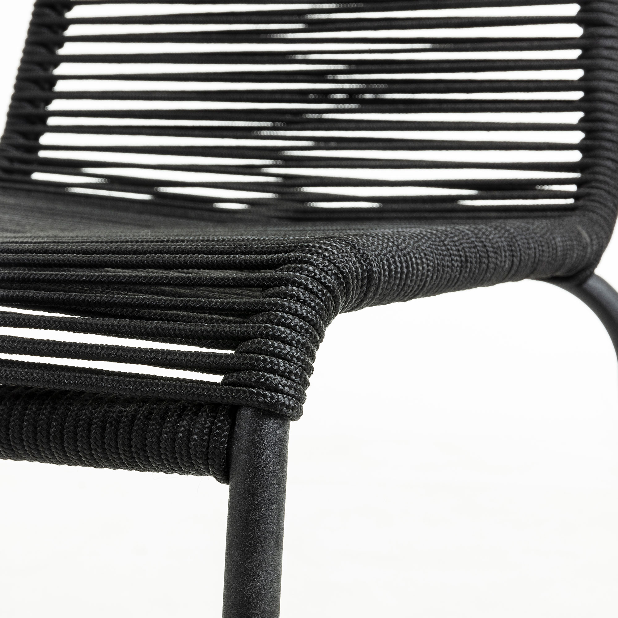 Silla con estructura de acero galvanizado pintado en polvo. Asiento y respaldo en cuerda de poliéster resistente a los rayos UV. Apilable. Para uso interior y exterior bajo techo.