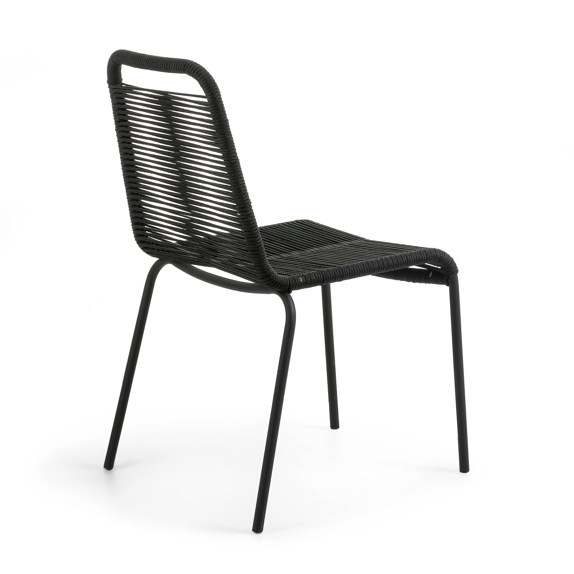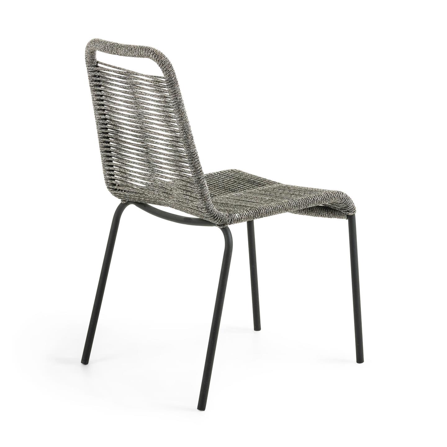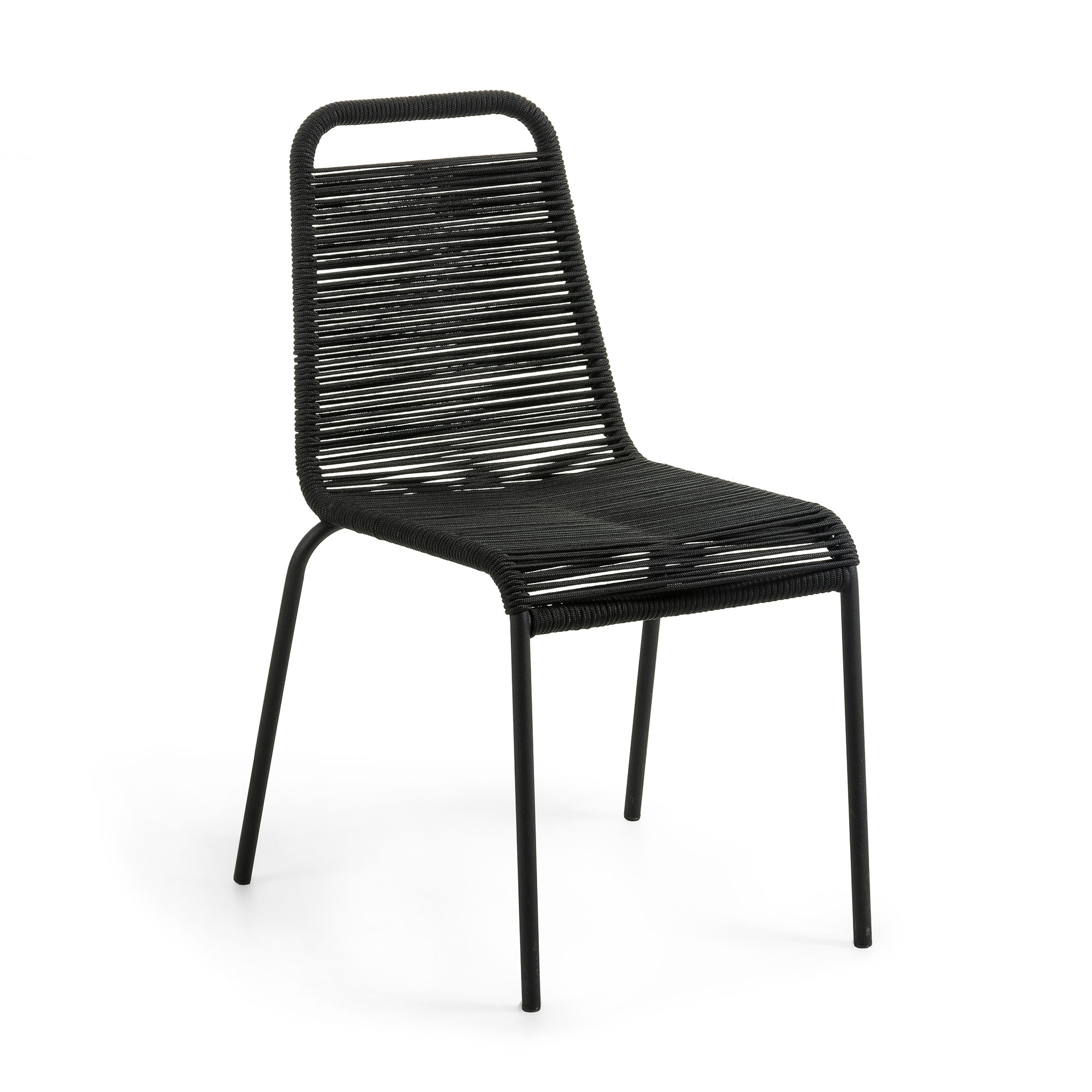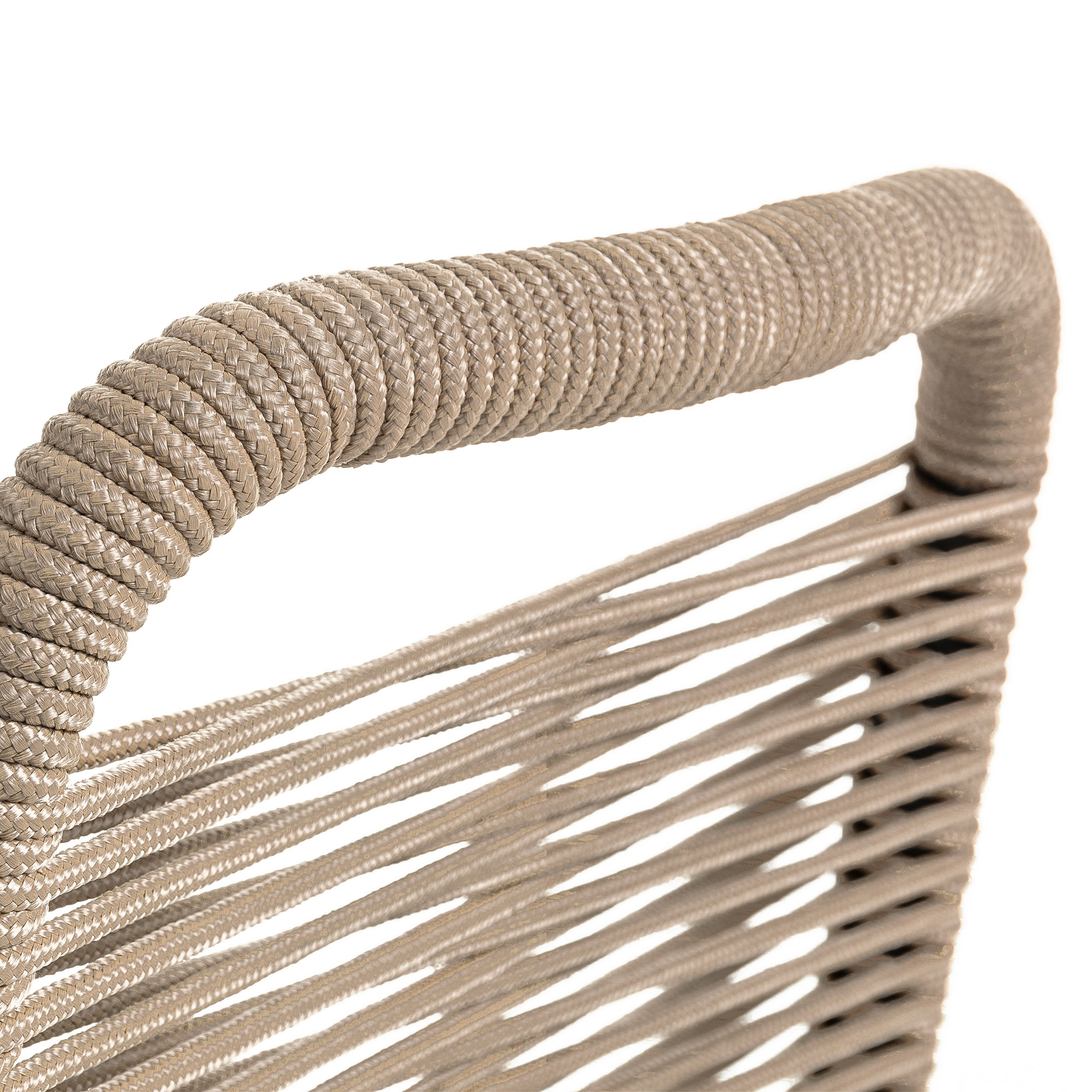 Silla con estructura de acero galvanizado pintado en polvo. Asiento y respaldo en cuerda de poliéster resistente a los rayos UV. Apilable. Para uso interior y exterior bajo techo.