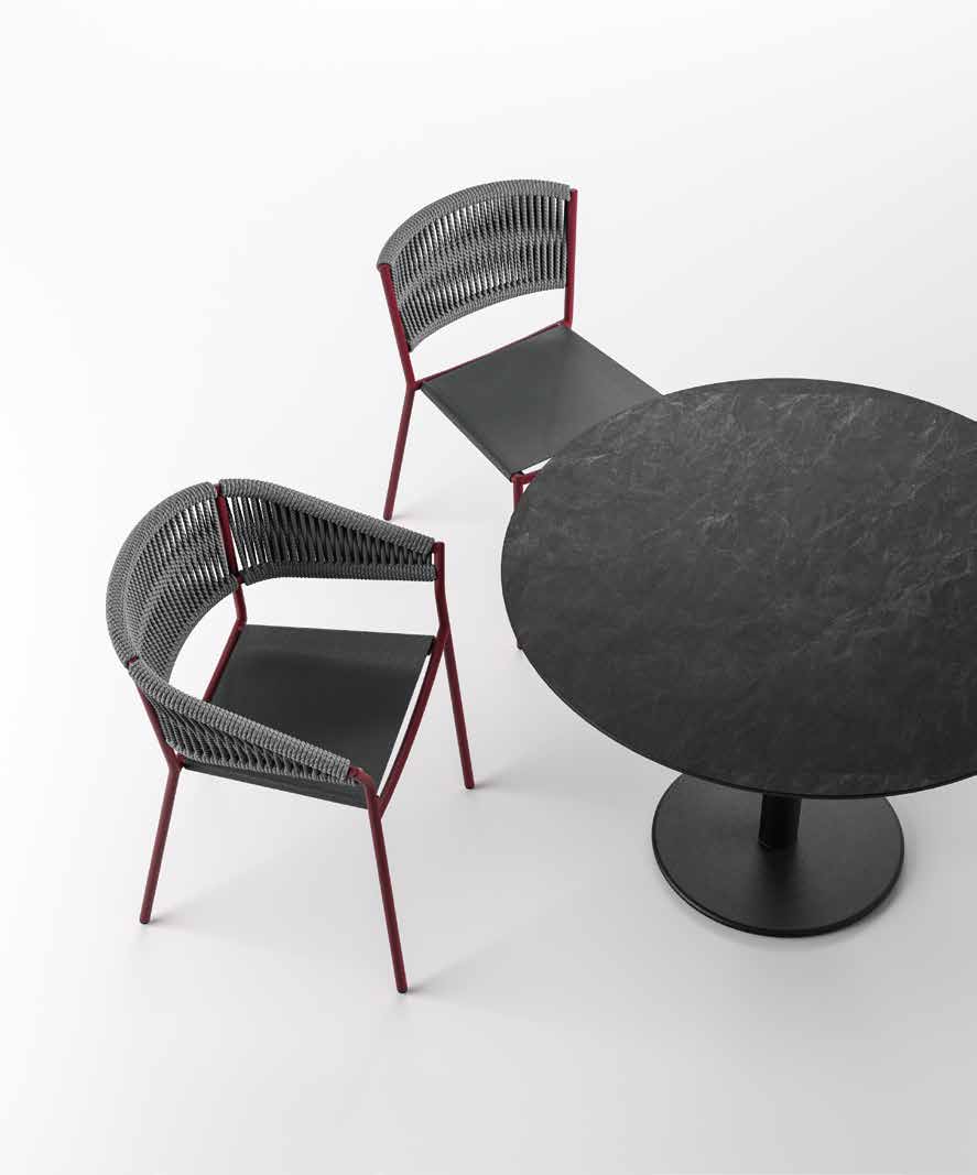 El asiento se caracteriza por una membrana Batyline, ligera, elegante, resistente a los rayos UV, al moho, a la intemperie, reciclable y fácilmente reemplazable.
