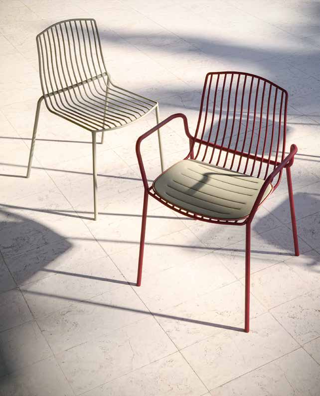 El asiento se caracteriza por una membrana Batyline, ligera, elegante, resistente a los rayos UV, al moho, a la intemperie, reciclable y fácilmente reemplazable.