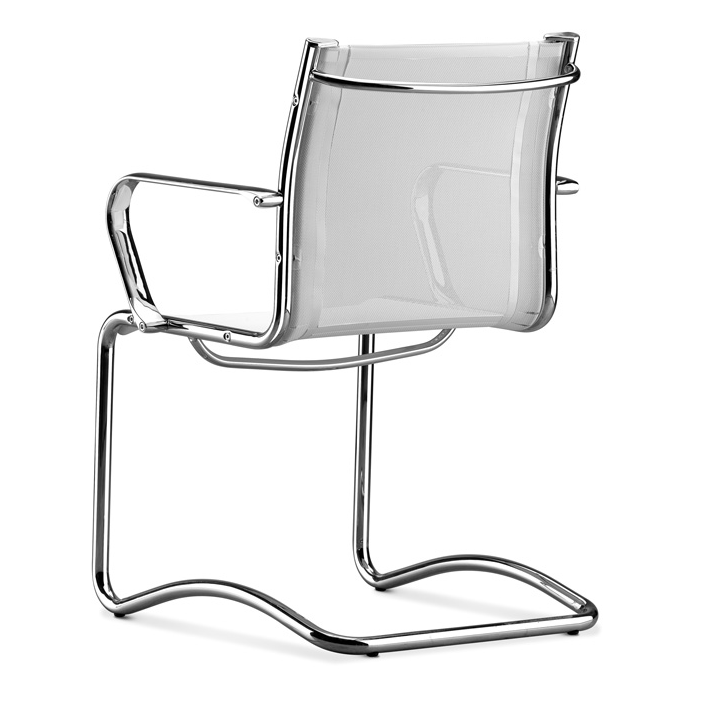 Sillón fijo de malla con estructura de acero cromado y brazos de aluminio pulido.