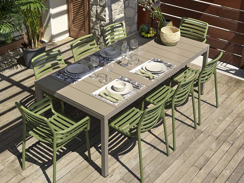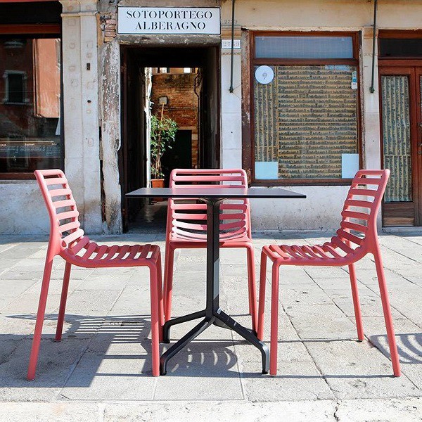 Una reinterpretación contemporánea del tema de las duelas para Doga Bistrot: un asiento de exterior sin reposabrazos de resina de fibra de vidrio. Es fácil de manejar, apilable, fácil de desinfectar y completamente reciclable.