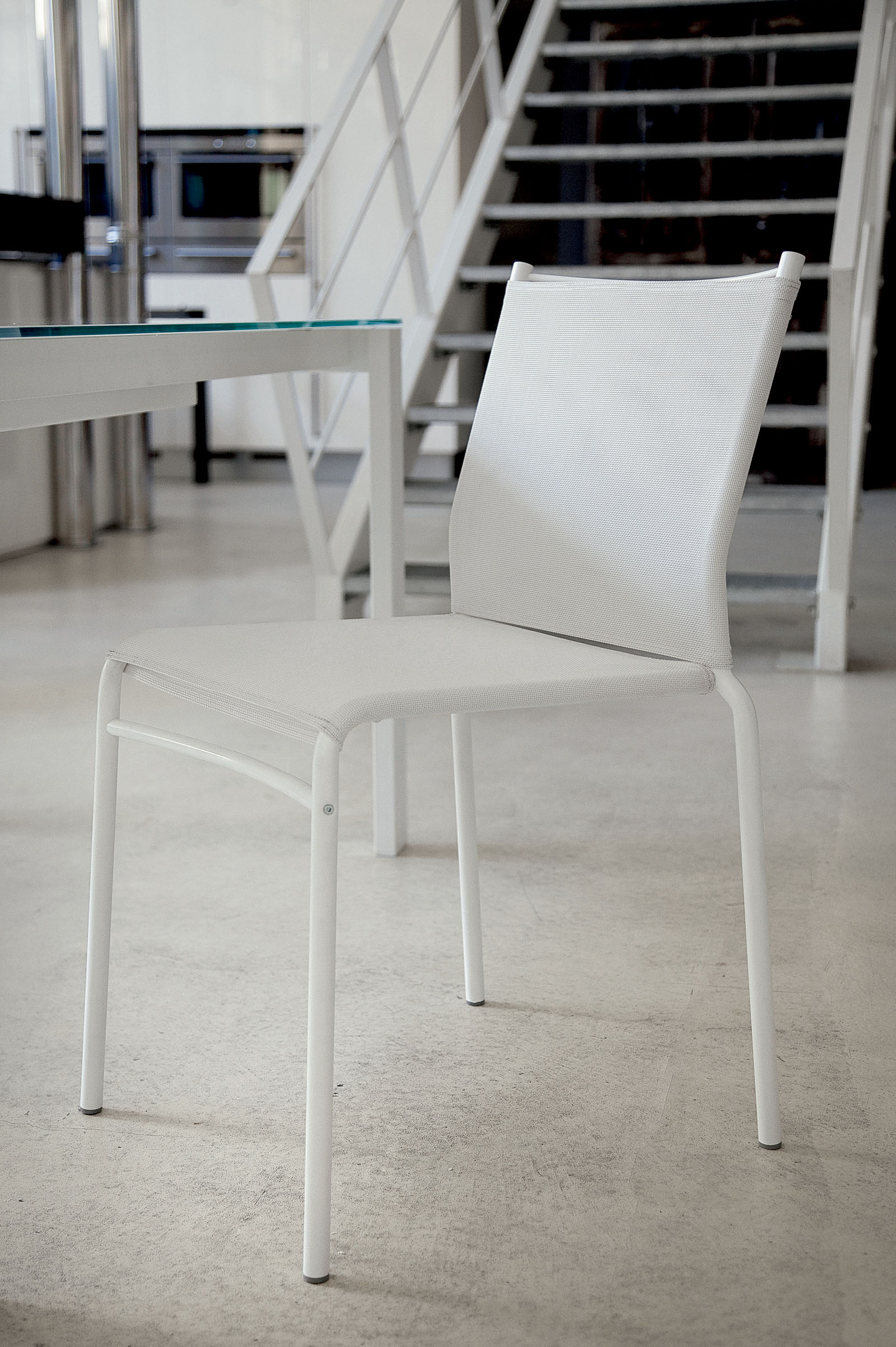 Silla con estructura de acero lacado ALUMINIO M089, BLANCO M306, ARENA M312, ANTRACITA M310 o NEGRO M055, asiento y respaldo en texplast o Soft textplast.