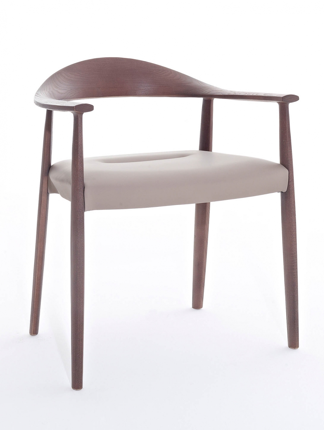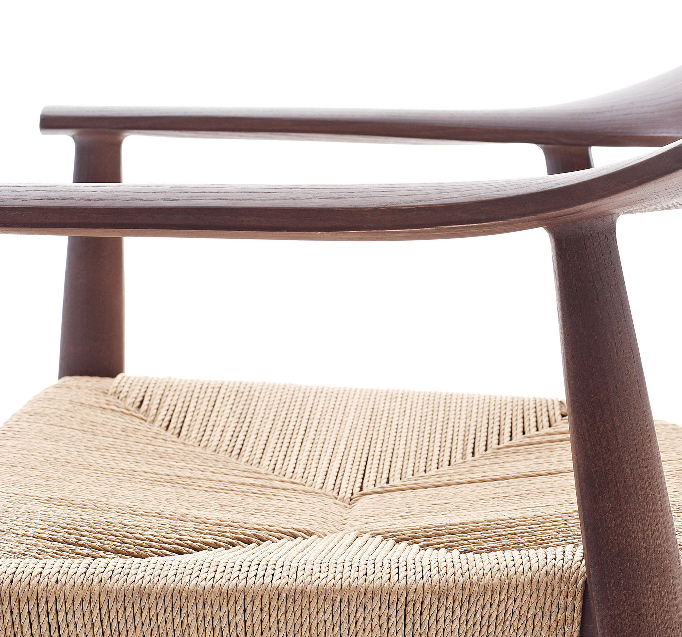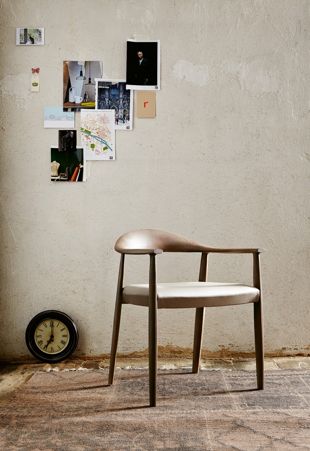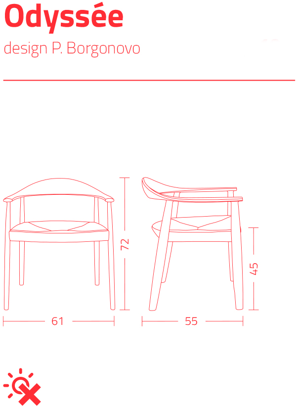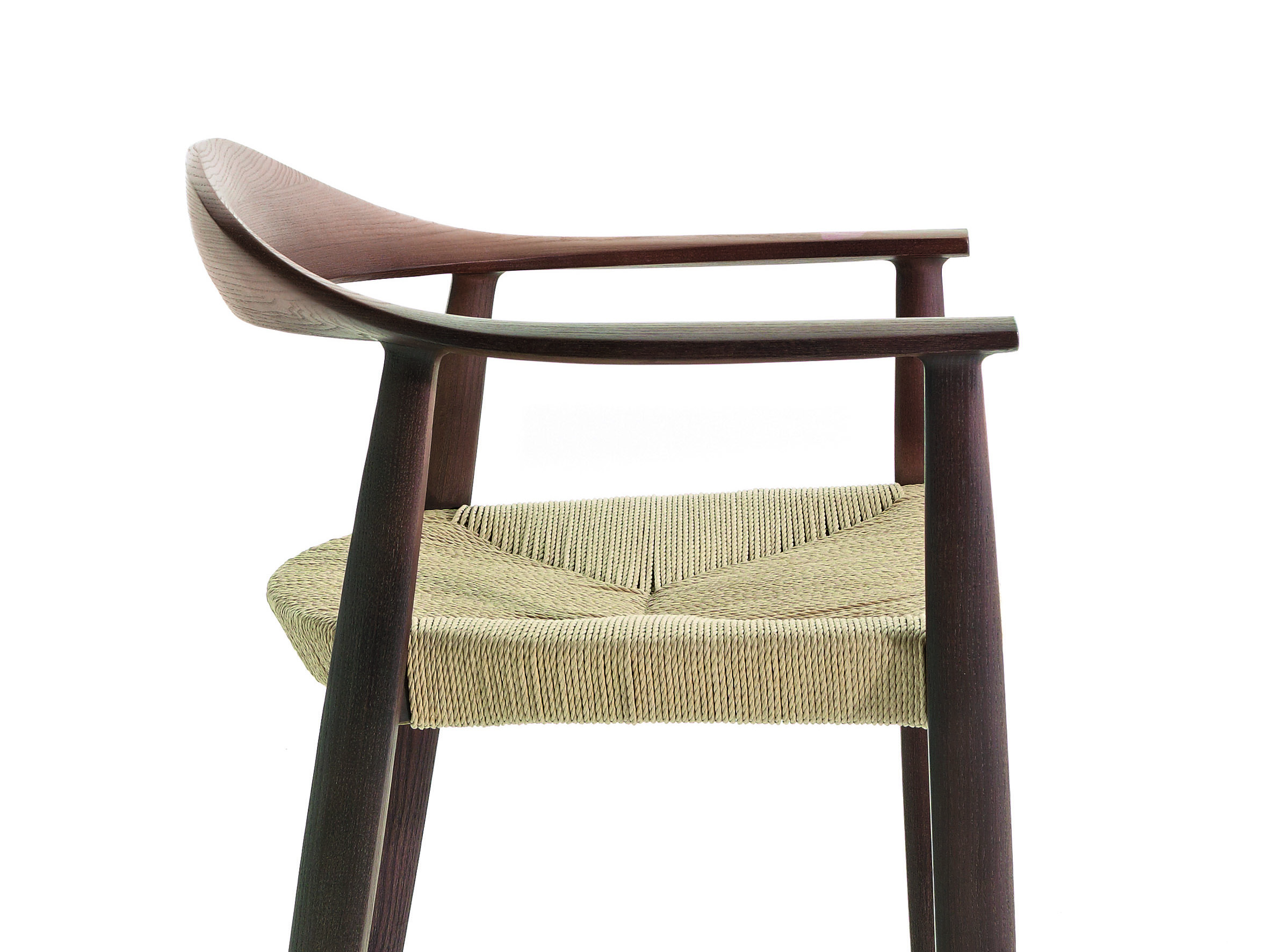 Silla con estructura de madera de fresno y asiento de paja tejida a mano o tapizado en tela o cuero.