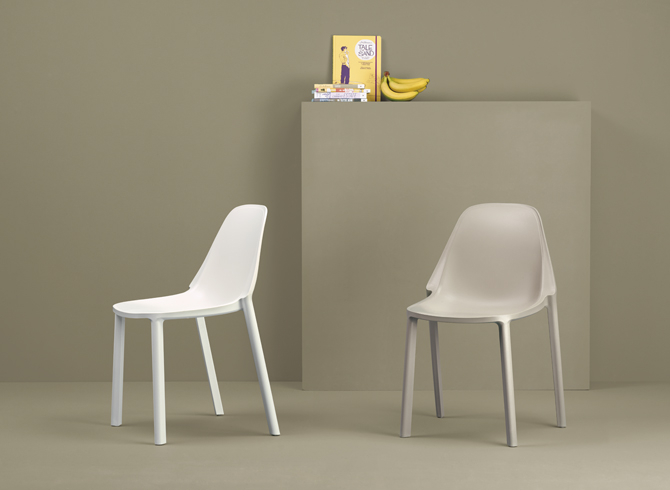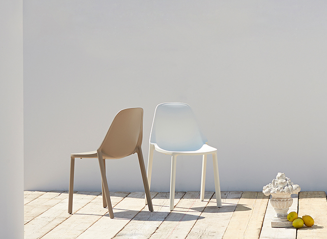 Estructura en tecnopolímero reciclable. Fibra de vidrio reforzada. Tecnología de moldeo por aire. Para uso en interiores/exteriores. Apilable. Sedia Più está pensada para un uso a gran escala en mobiliario contract, gracias al nuevo palet de 24 piezas que es fácil de maniobrar con una carretilla elevadora y fácil de almacenar.