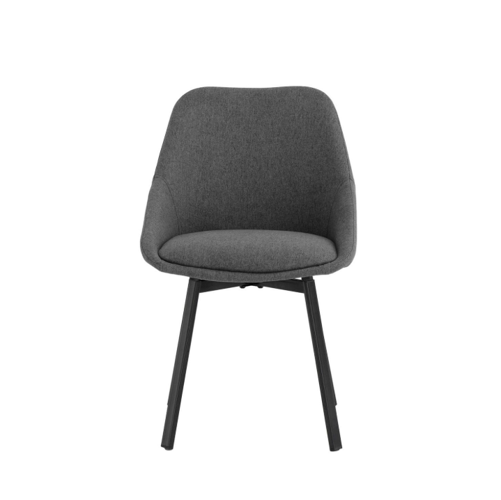 Esta silla cuenta con un mecanismo giratorio de 180° con retorno automático, ideal para espacios dinámicos. El respaldo curvo y el asiento acolchado están tapizados en tela 100% poliéster en gris claro, lo que añade un toque de sofisticación y versatilidad a cualquier ambiente moderno.