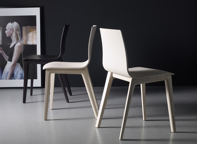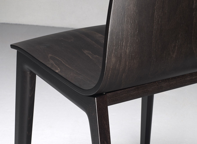 El cuerpo está fabricado en madera contrachapada de haya, con un espesor variable que confiere una estructura sólida y resistente, adaptándose a las necesidades ergonómicas y de diseño.
