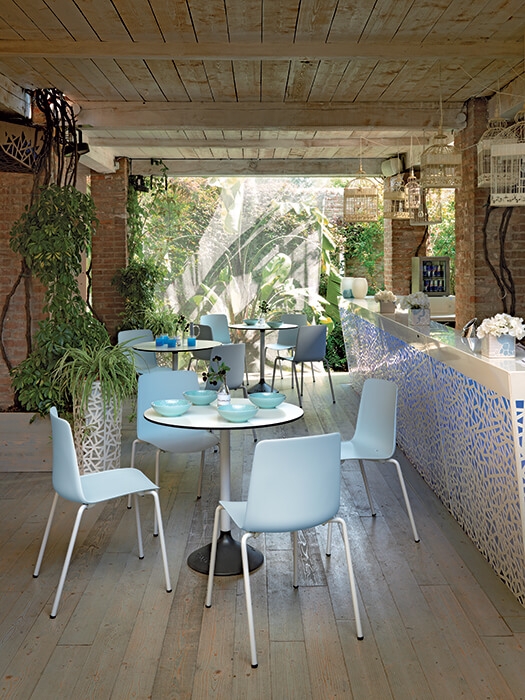 Apilables, son adecuados tanto para espacios interiores, en la versión con base cromada, como para exteriores en la versión con base pintada. El concepto es ofrecer una colección de productos deliberadamente limitada a unos pocos modelos, orientada al sector de la restauración, pero no solo, gracias a la versatilidad que ofrece el diseño esencial y la gama de combinaciones de colores cuerpo / marco.