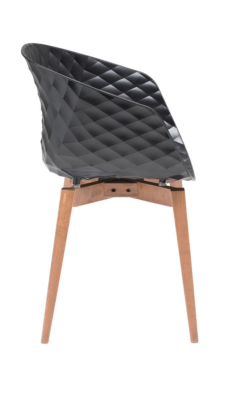 La silla de madera Uni-Ka 599 con su forma de concha ergonómica y envolvente ofrece un confort de asiento perfecto: un respaldo que garantiza un buen soporte para la espalda, una postura cómoda y reposabrazos de concha anchos