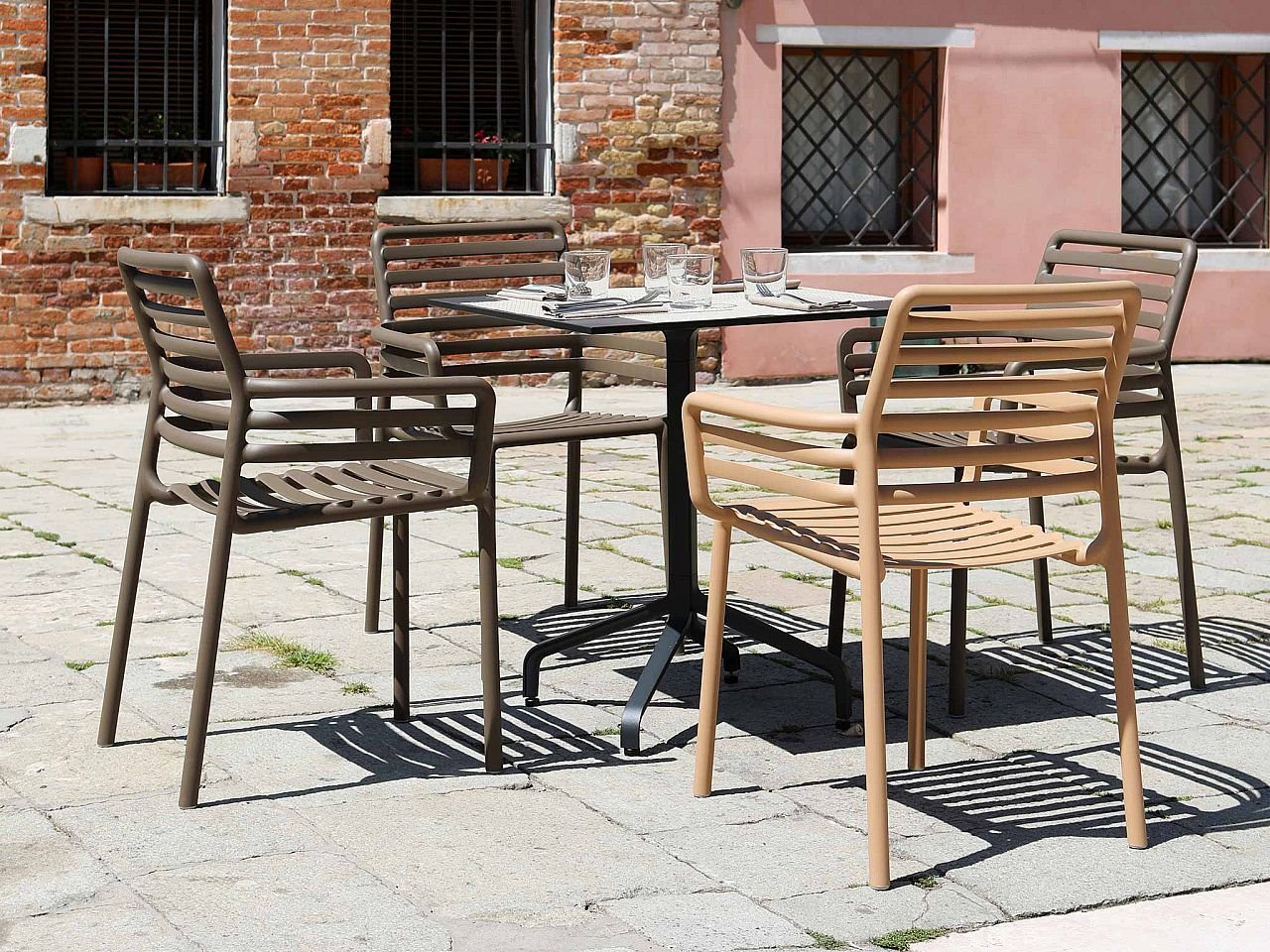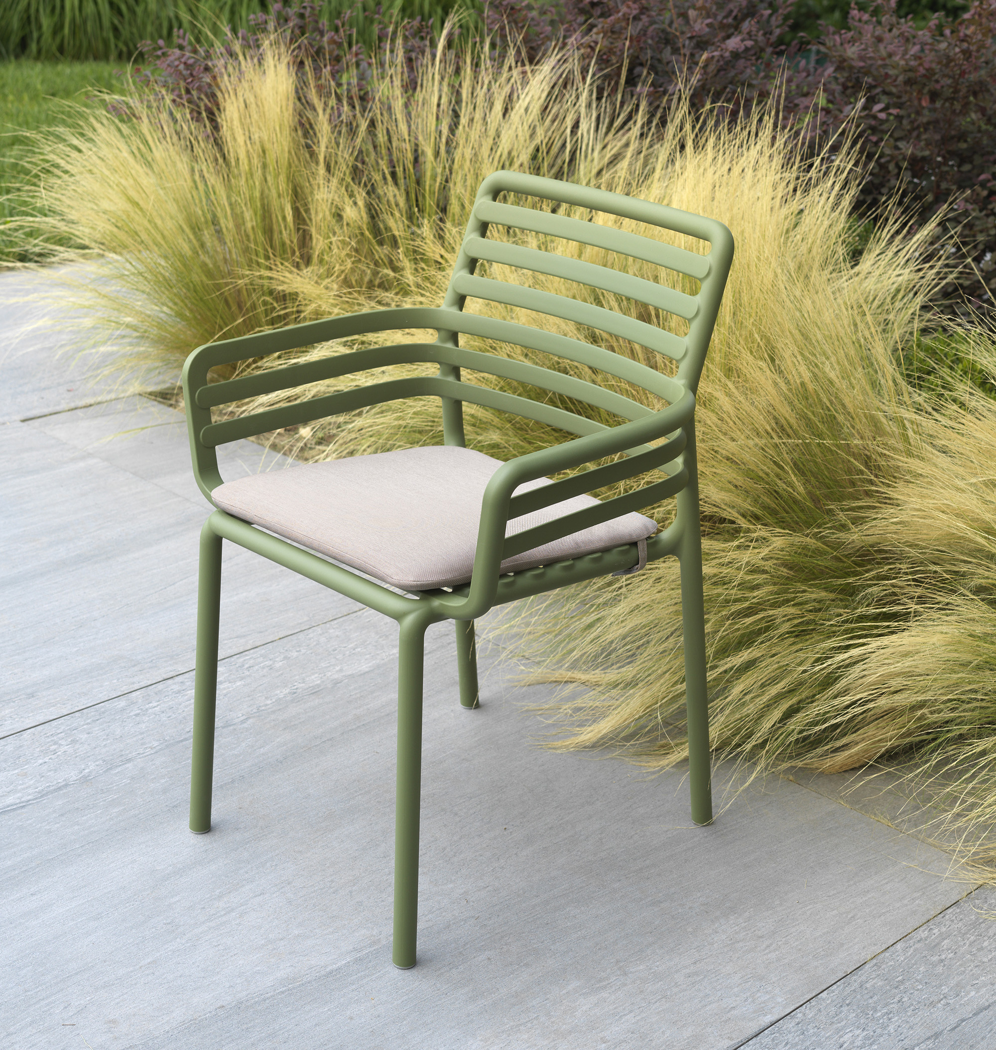 Silla monobloque con reposabrazos. Material: polipropileno de fibra de vidrio teñido en masa con tratamiento anti-UV. Apilable. Acabado mate. Equipado con pies antideslizantes. Cojín disponible bajo pedido. Resina reciclable.