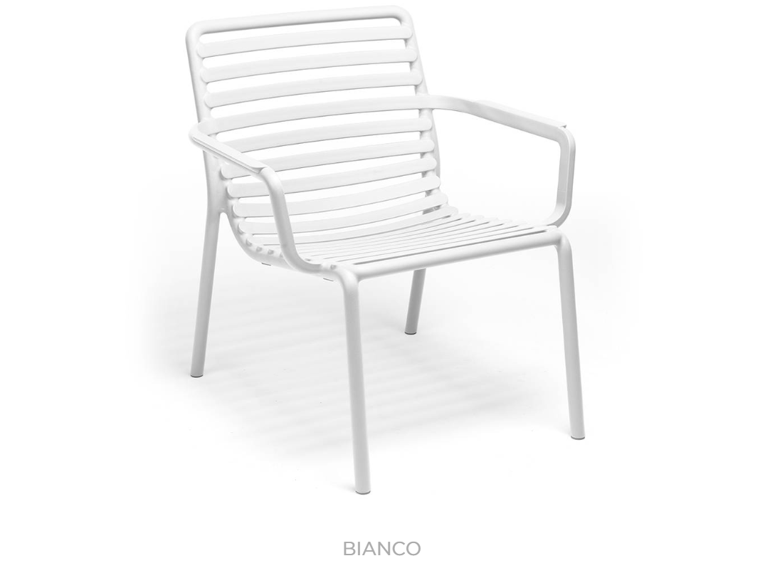 Gran sillón bajo relajante para exterior en resina de fibra de vidrio caracterizado por un juego de macizos y huecos salpicado por una secuencia de lamas horizontales. Apilable, fácilmente higienizable y reciclable.