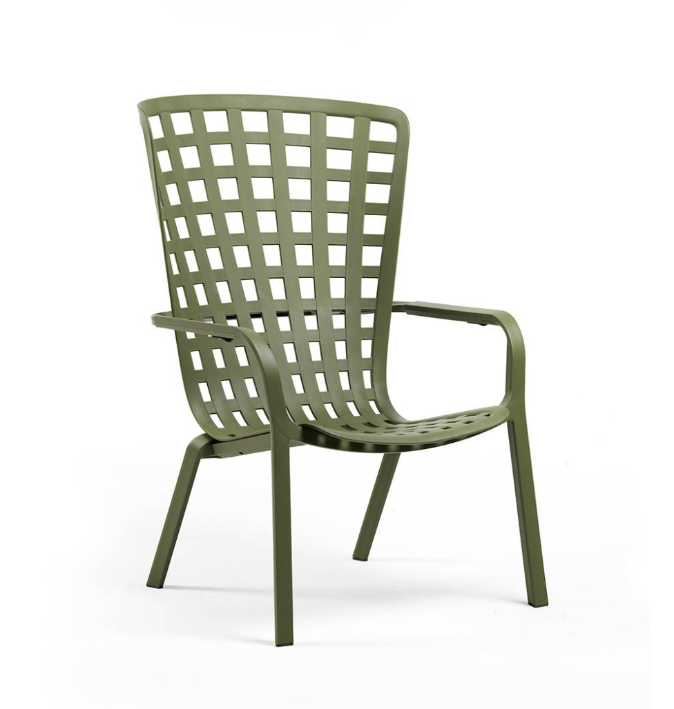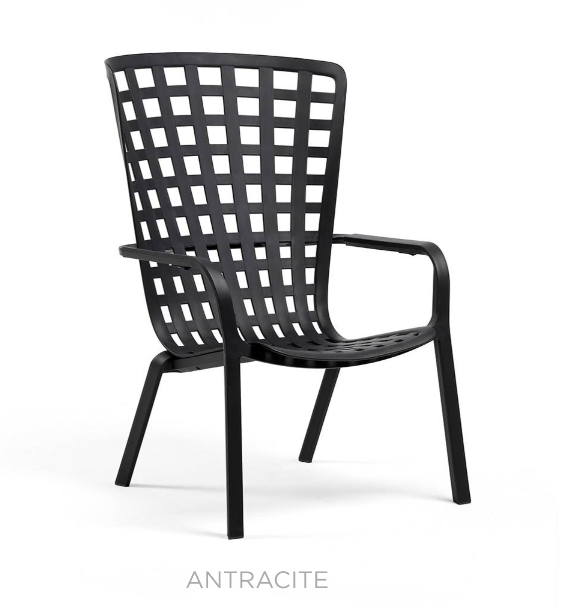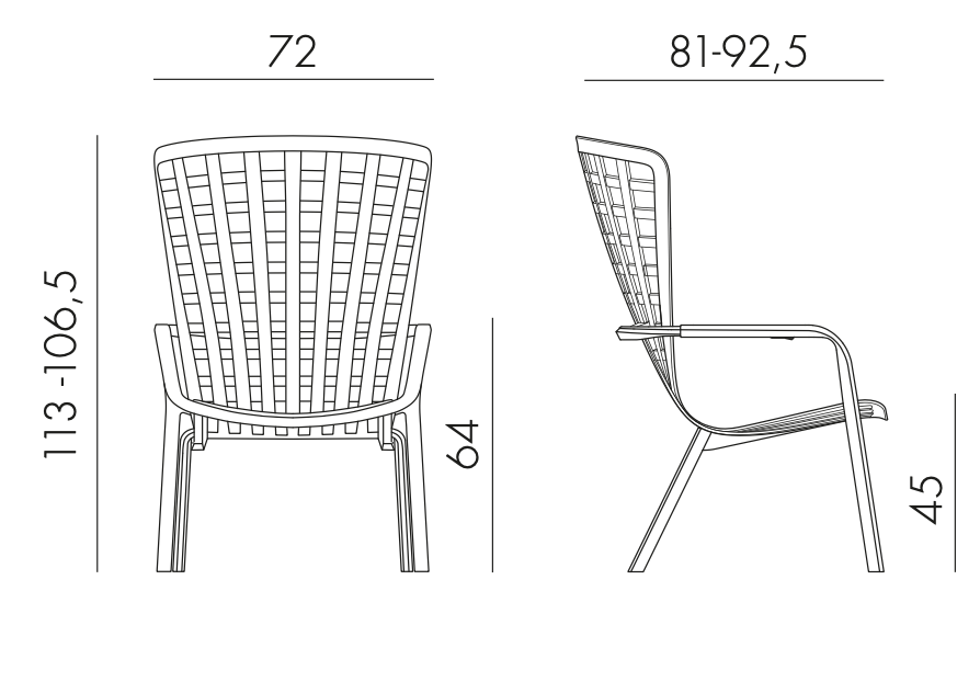 Sillón reclinable. Material: polipropileno de fibra de vidrio con tratamiento anti-UV y teñido en masa. Acabado mate. Patas antideslizantes. Cojín disponible bajo pedido. Resina reciclable.
