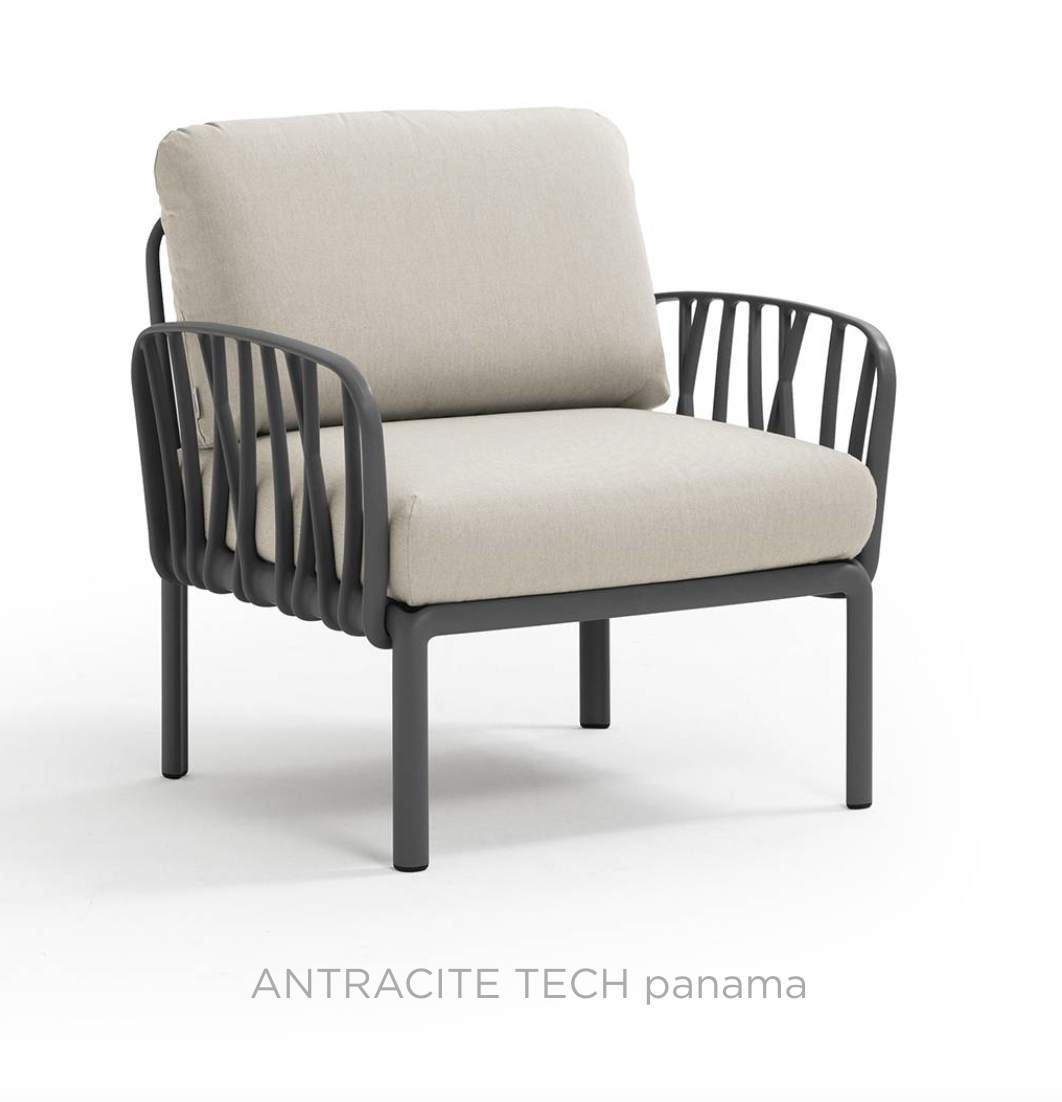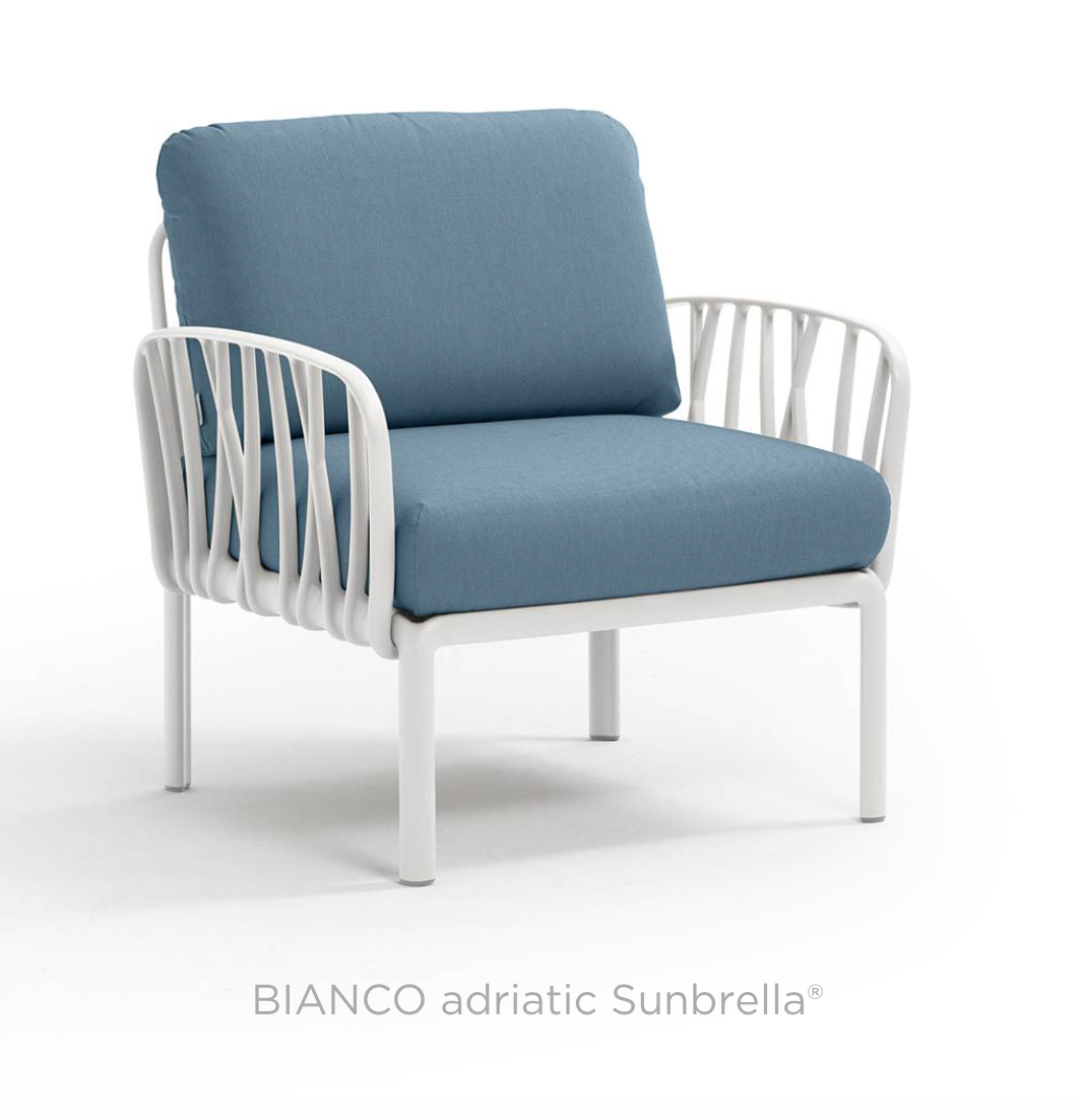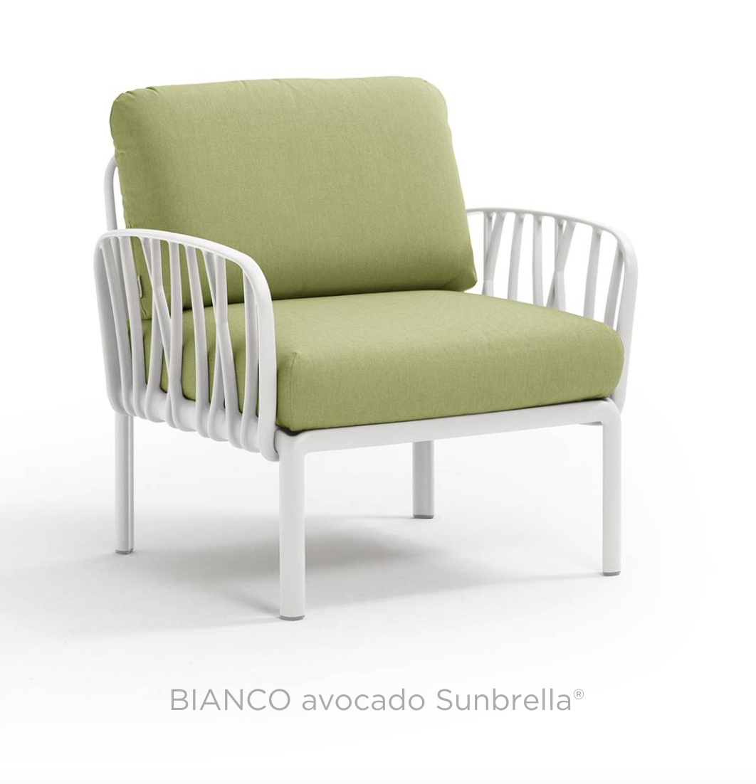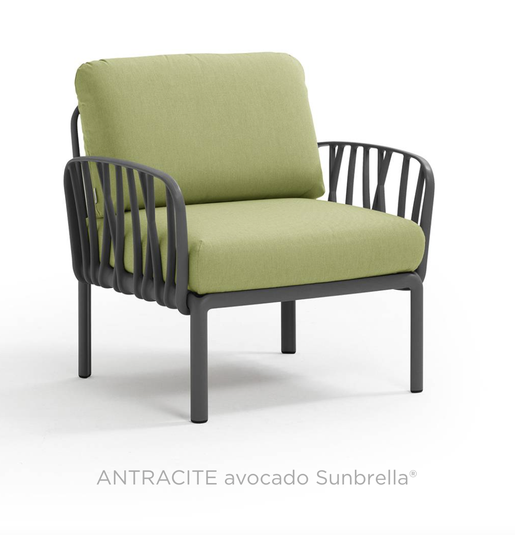 Sillón de relajación con resina de fibra de vidrio y reposabrazos acolchados. Se puede comprar individualmente o diseñar como un elemento de composición en conjuntos más grandes de la colección de asientos modulares de Komodo.