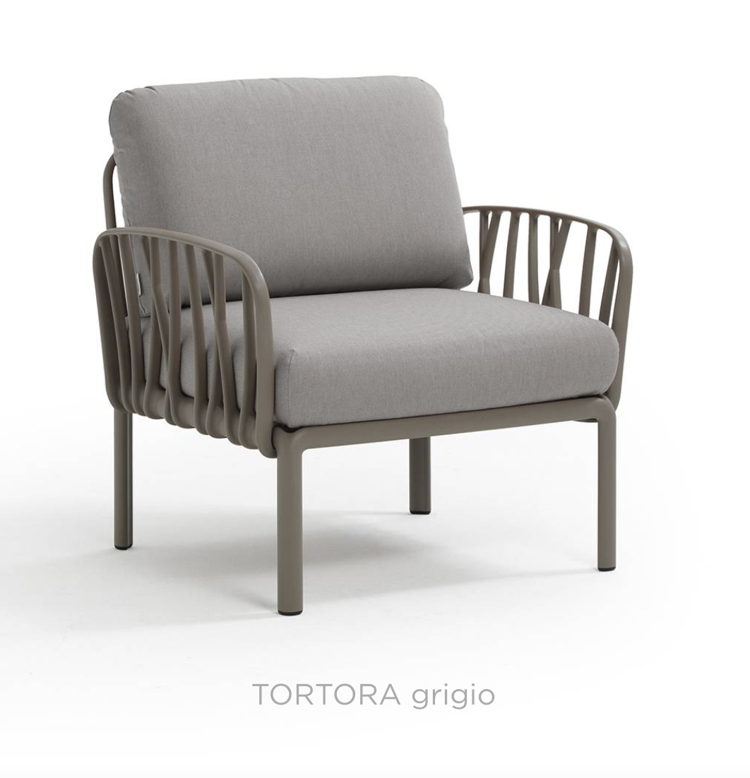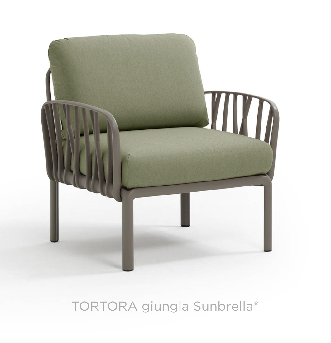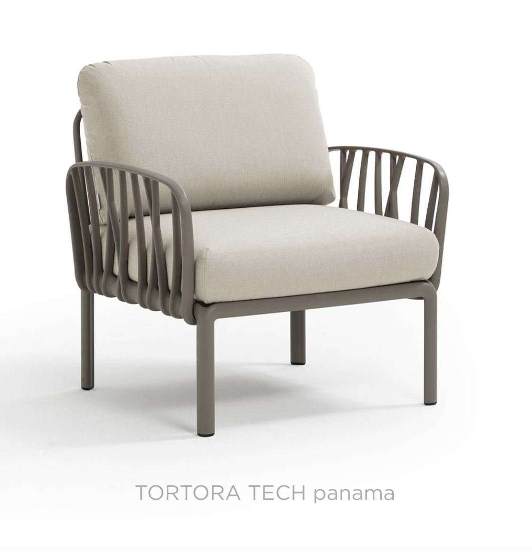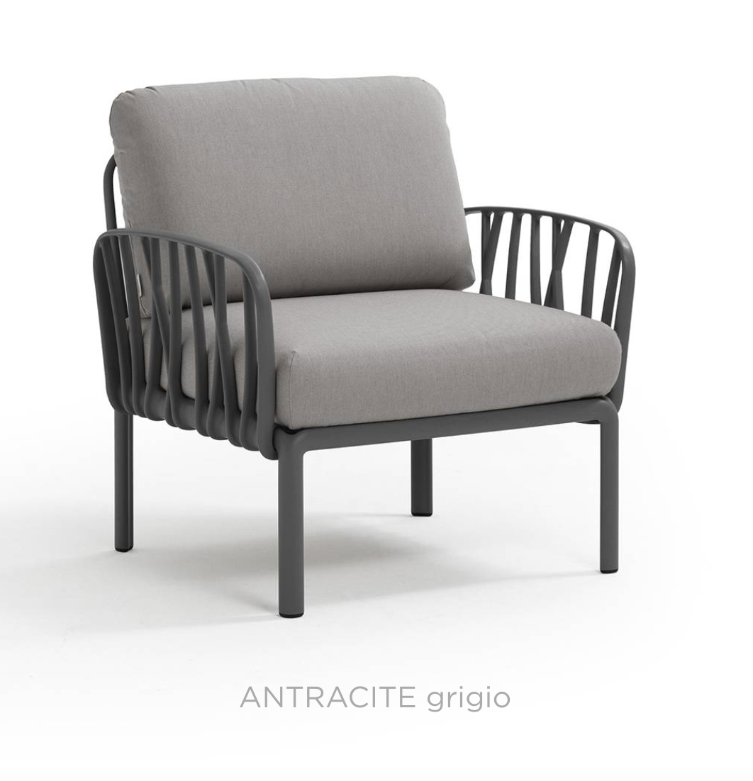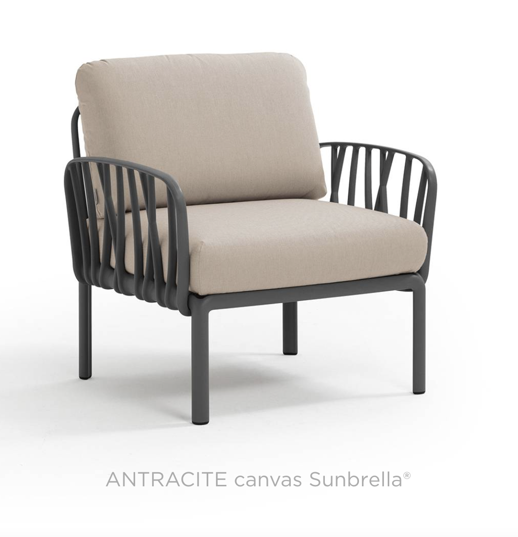 Sillón de relajación con resina de fibra de vidrio y reposabrazos acolchados. Se puede comprar individualmente o diseñar como un elemento de composición en conjuntos más grandes de la colección de asientos modulares de Komodo.