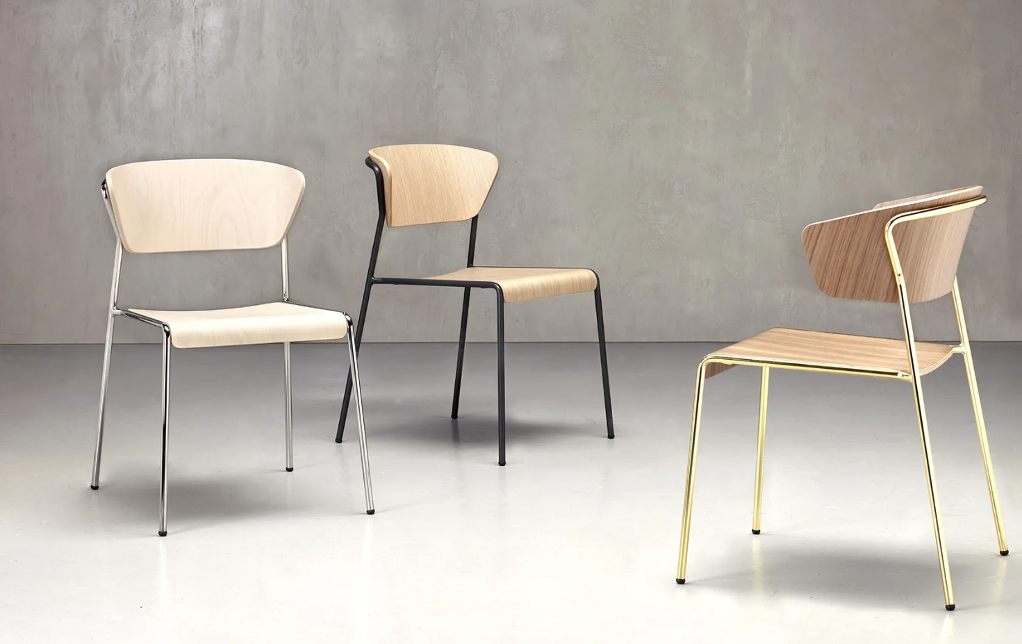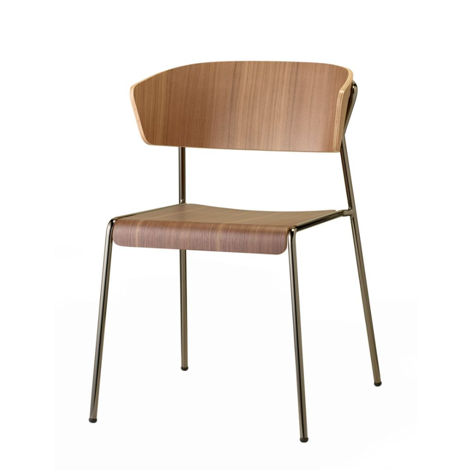 El asiento y el respaldo, realizados en contrachapado de haya curvado , aportan calidez y refinamiento, mientras que la estructura de acero pintado garantiza solidez y ligereza visual.
