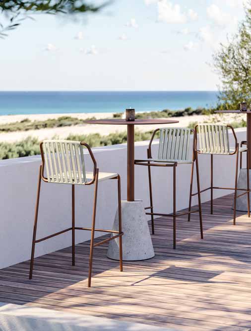 El asiento se caracteriza por una membrana Batyline, ligera, elegante, resistente a los rayos UV, al moho, a la intemperie, reciclable y fácilmente reemplazable.