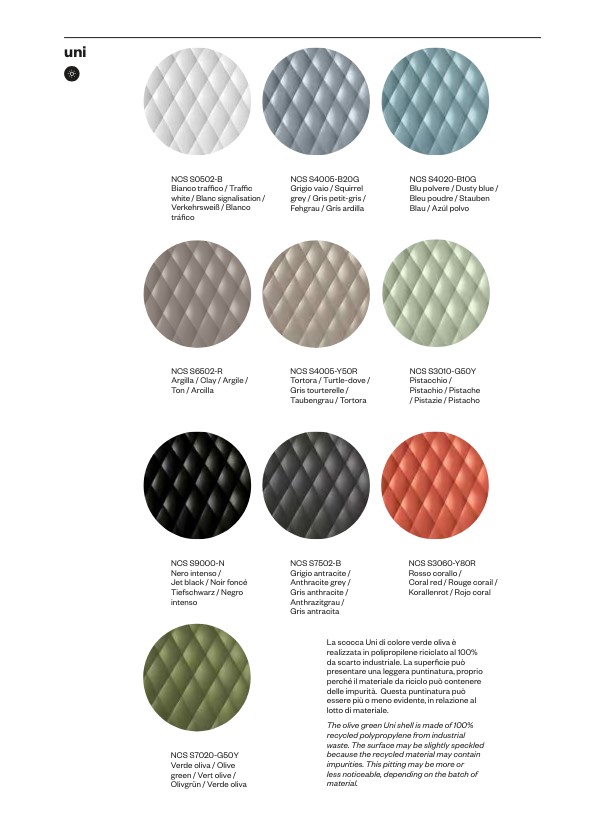 El sillón Uni-Ka 600 tiene un diseño único: combina polipropileno con efecto acolchado . El asiento envolvente y redondeado de polipropileno está sostenido por una estructura de acero pintado con base central. Giratoria 360° lo que la convierte en una silla versátil y funcional. El cuerpo se caracteriza por el tejido de polipropileno que reproduce un efecto acolchado. Perfecto para incluir en proyectos de decoración de lugares abiertos al público, ideal también para oficinas o salas de espera, restaurantes o comercios.