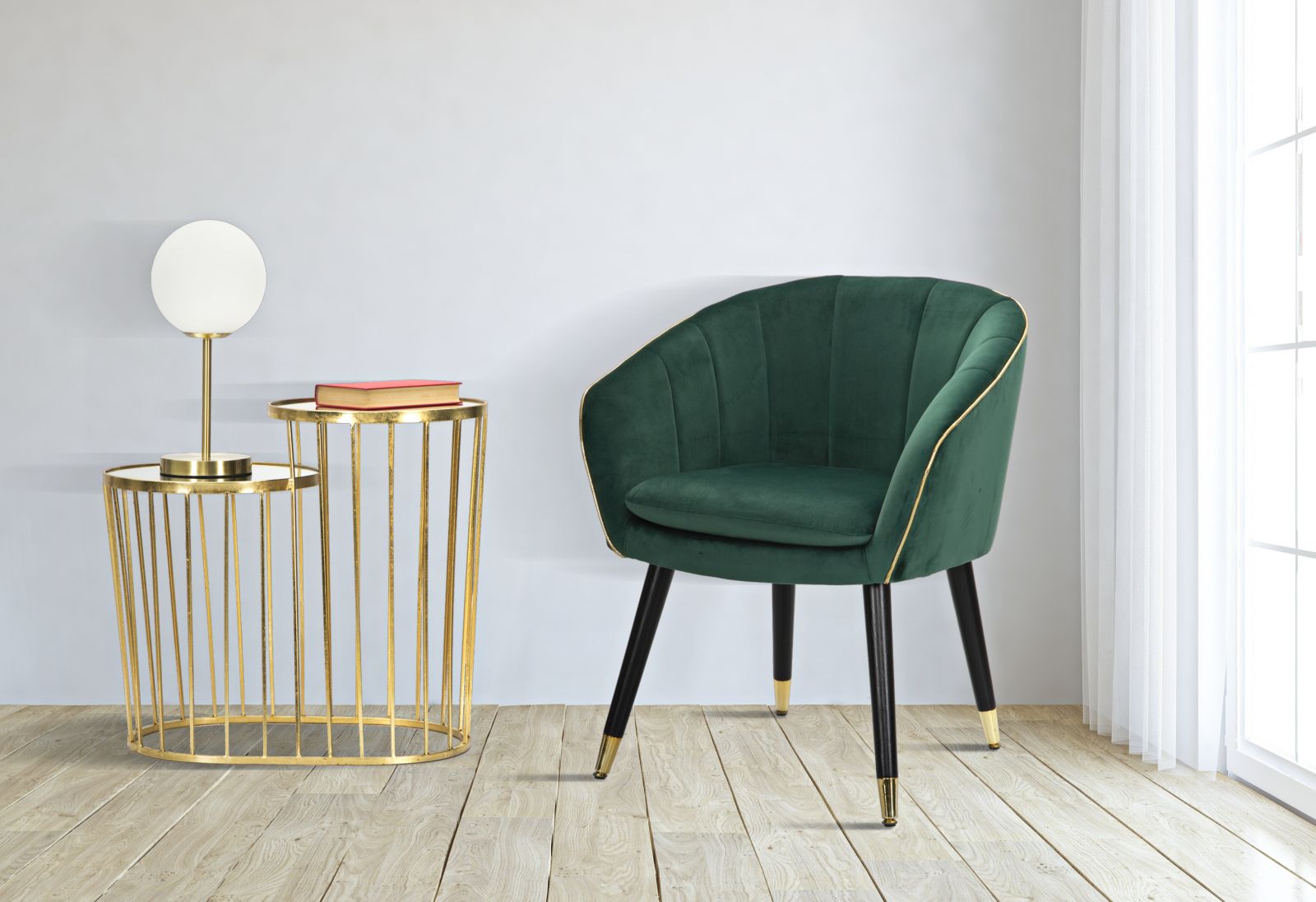 Butaca tapizada en tela verde con detalles dorados y patas de madera negra con detalles dorados. La elegancia de la tela y el oro combinados para ofrecer una cómoda relajación.