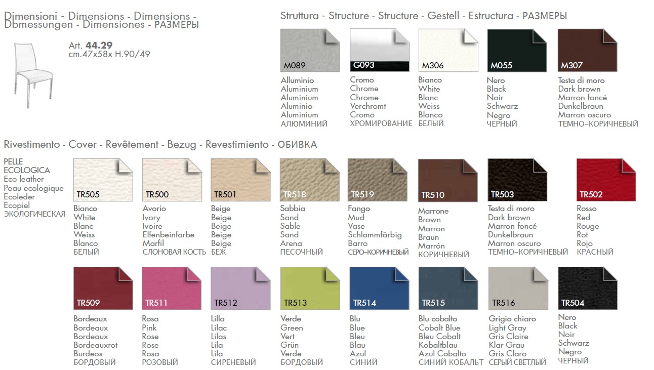 Silla con estructura de acero ALUMINIO M089, BLANCO M306, MARRÓN OSCURO M307, ANTRACITA M310, NEGRO M055, asiento acolchado y respaldo tapizado en cuero ecológico en los colores: BLANCO TR505, MARFIL TR500, BEIGE TR501, ARENA TR518, MUD TR519, MARRÓN TR510, MARRÓN OSCURO TR503, ROJO TR502, BURDEOS TR509, ROSA TR511, LILAC TR512, VERDE TR513, AZUL TR514, AZUL COBALT TR515, GRIS CLARO TR516, ANTRACITA TR517, NEGRO TR504 Dimensiones: 47x58xh90 / 49 cm envíe un correo electrónico a info@tecnoarredo3.com Aumento de precio para la estructura cromada G093, para información contáctenos en info@tecnoarredo3.com