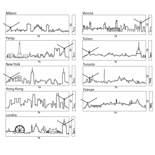 Reloj de pared en madera pintada. Movimiento de batería de cuarzo. Ciudades: Milán, Florencia, Turín, Verona, París, Londres, Nueva York, Toronto y Hong Kong.
