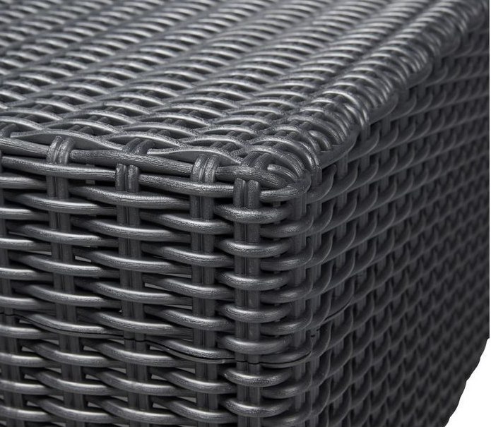 Fabricado en polipropileno tejido con efecto ratán, este sofá combina durabilidad y estilo para amueblar jardines, terrazas o balcones.