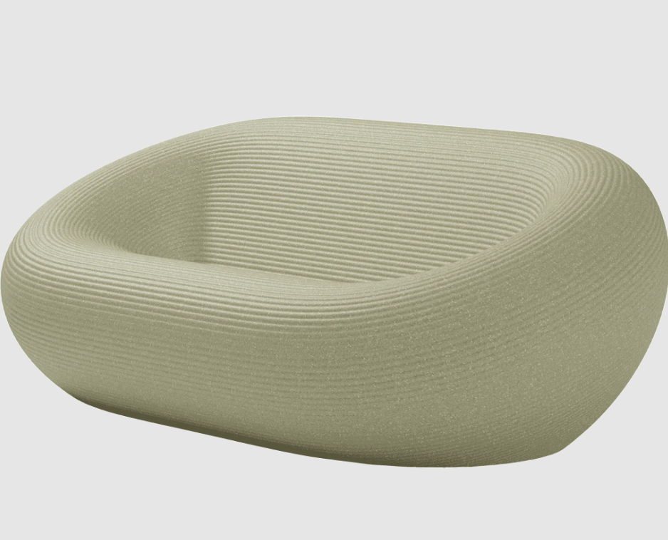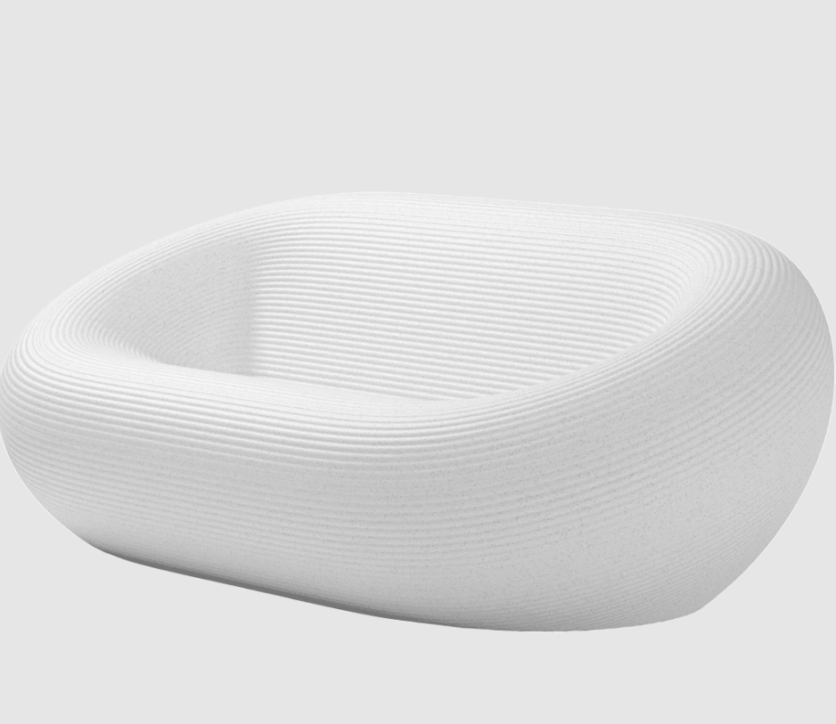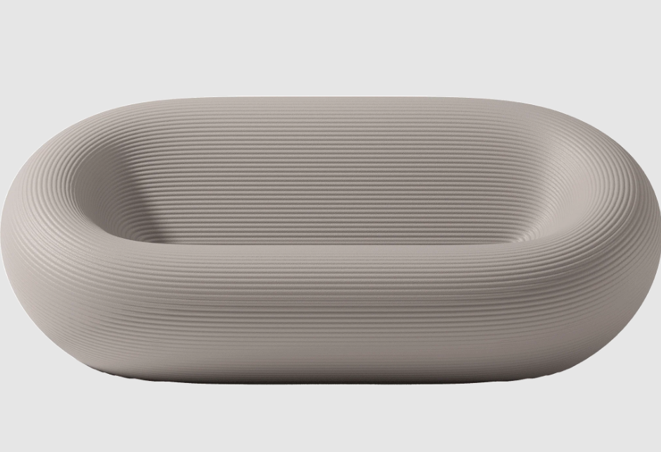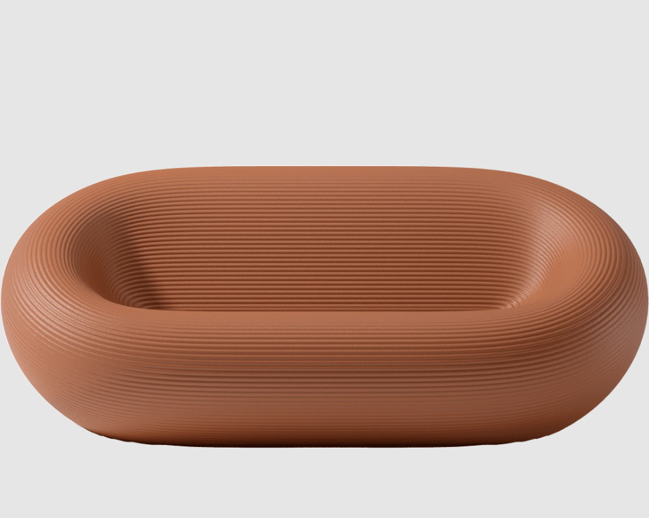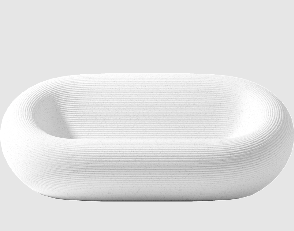 Sofá de exterior en polietileno reciclable, con forma lineal en el centro y curvas en los extremos.