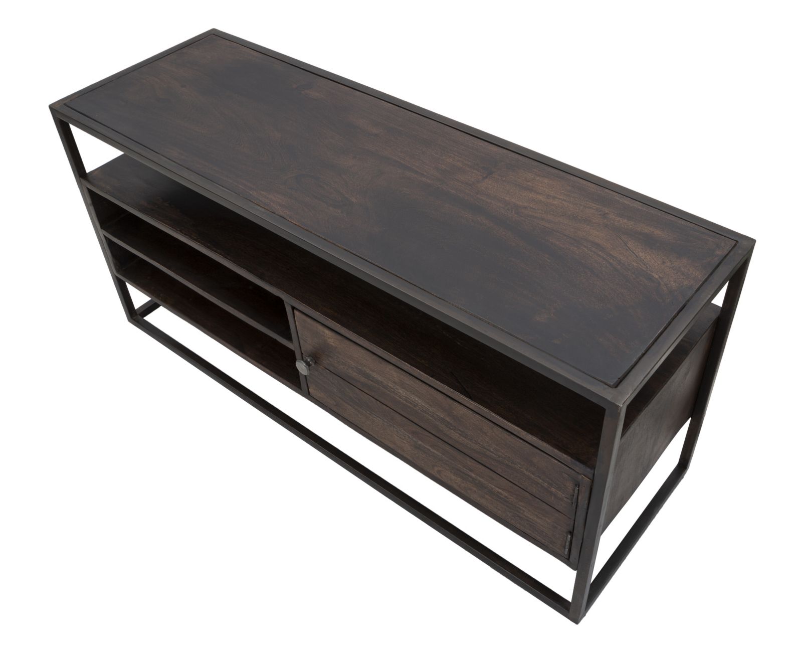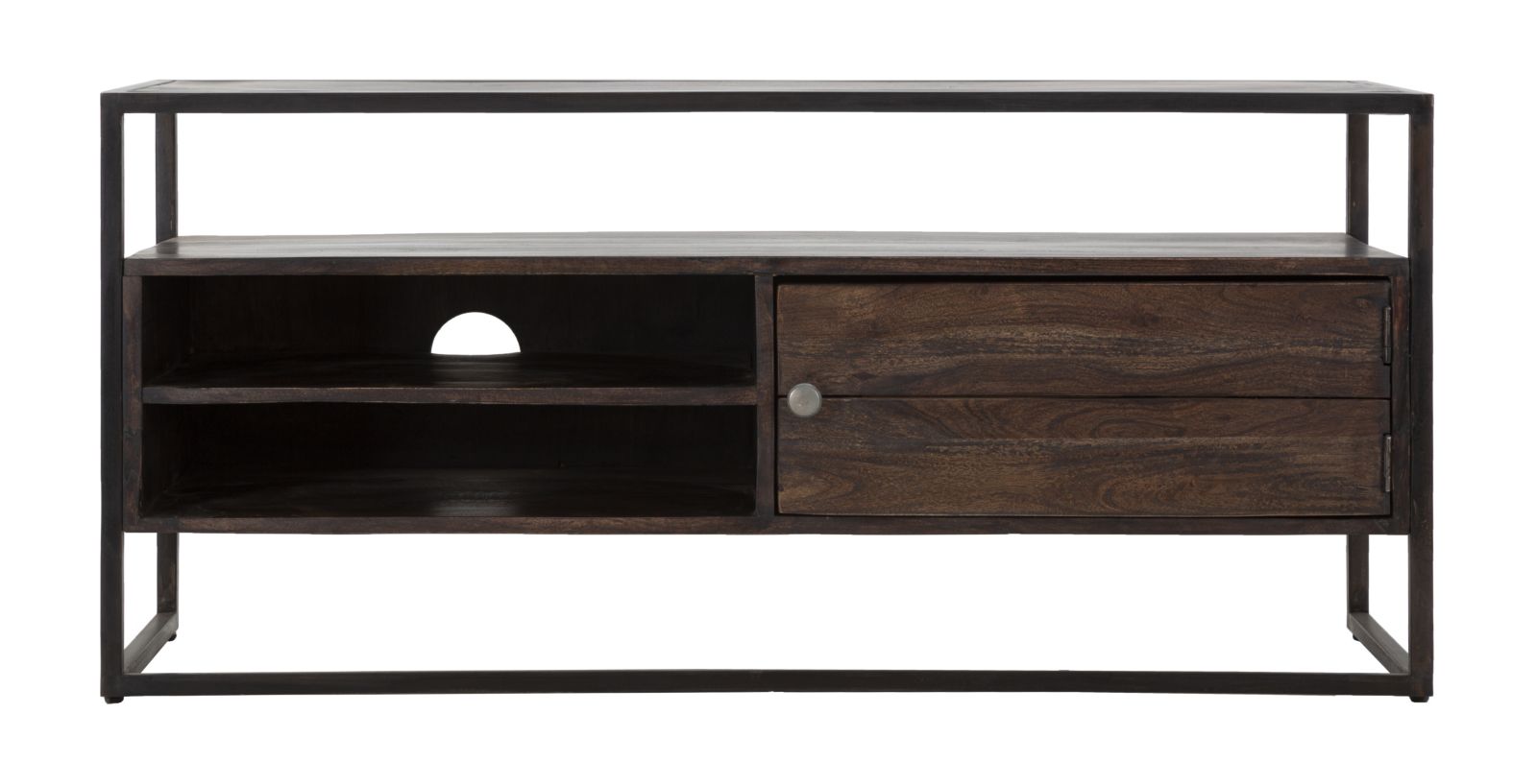 Mueble TV en madera maciza de acacia con 3 baldas y puerta enmarcada en una estructura de metal negro de líneas limpias y cuadradas que aporta un toque de modernidad a una pieza extremadamente elegante y clásica.