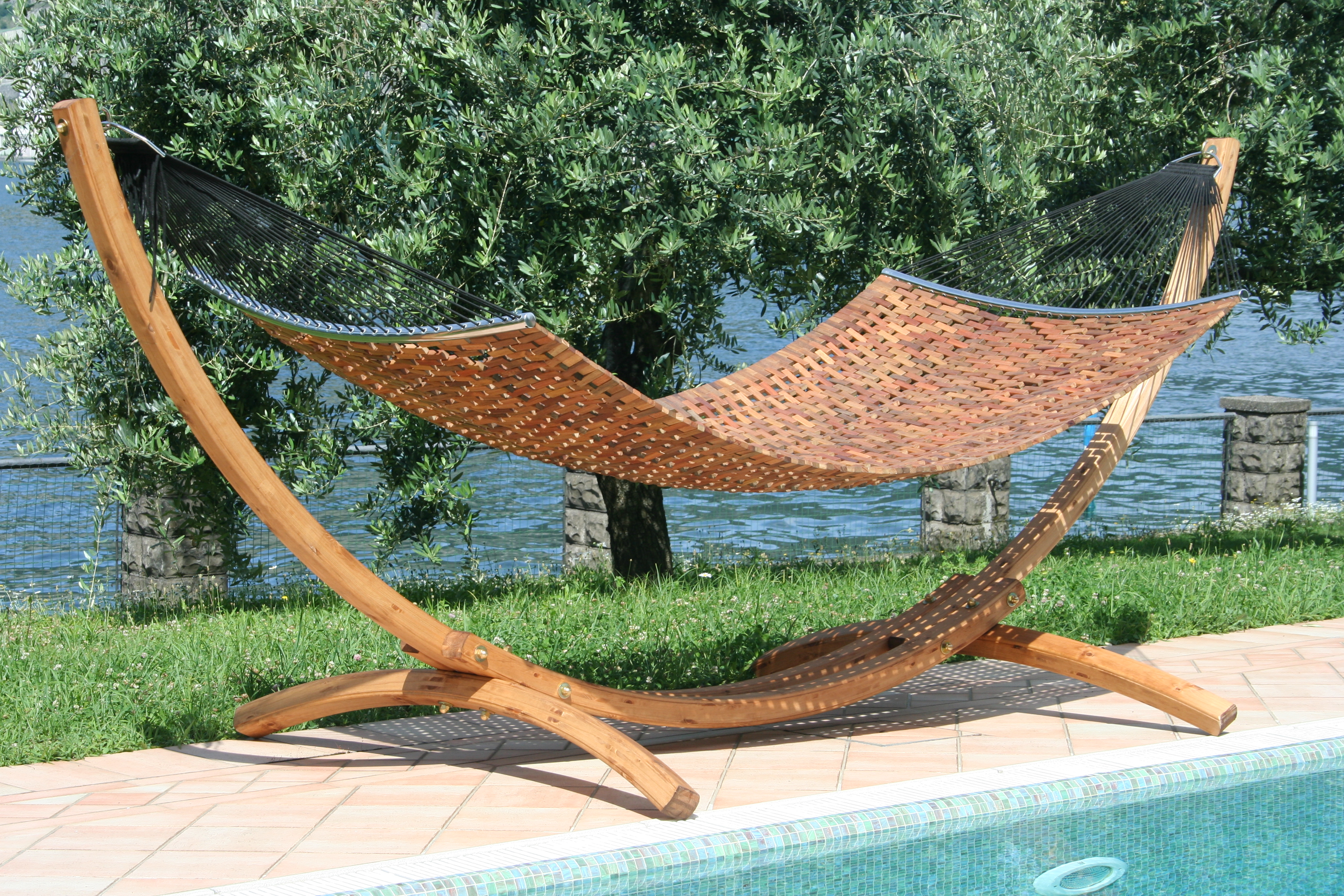 Soporte de madera laminada en caja con hamaca A3000, hamaca compuesta de pequeñas maderas de acacia enhebradas en trenzas de poliéster. Dimensiones: 330x145x150 cm.